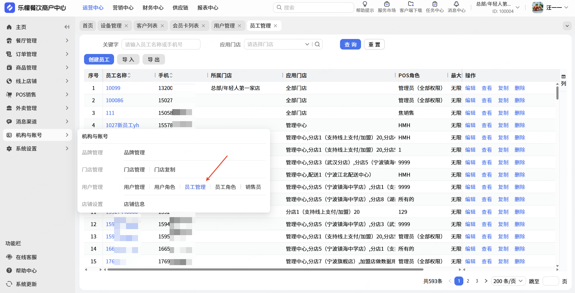 👉【操作路径】:①后台——运营中心——机构与账号——员工管理