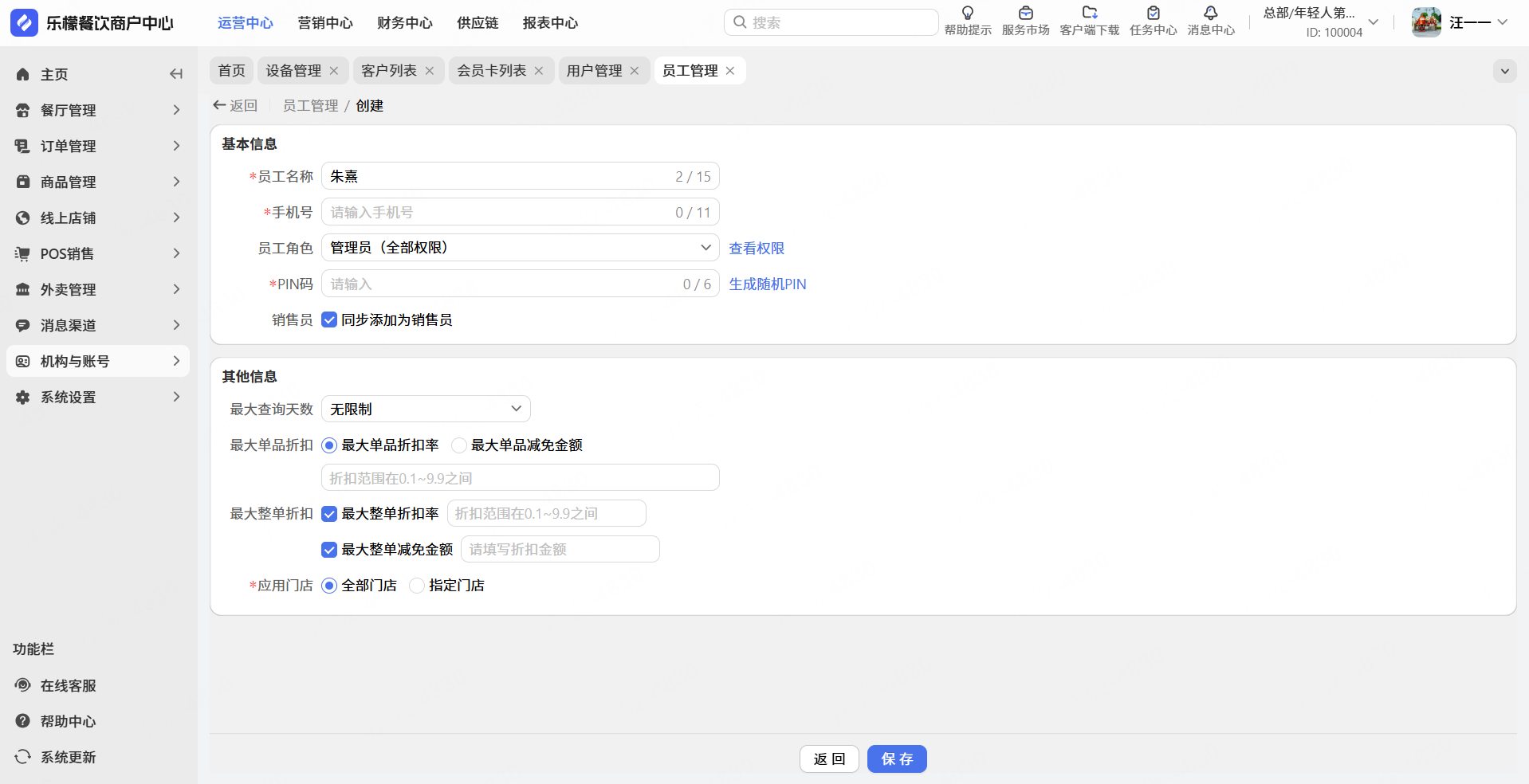 创建员工,姓名和手机号码按照实际进行填写,PIN就是前台收银软件登录的pin码