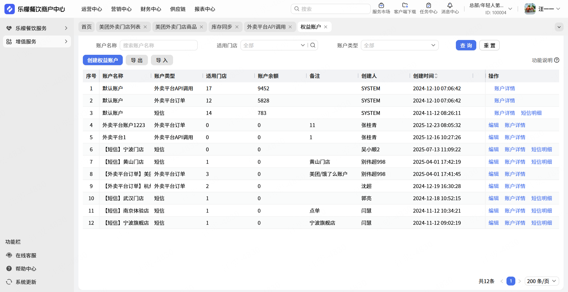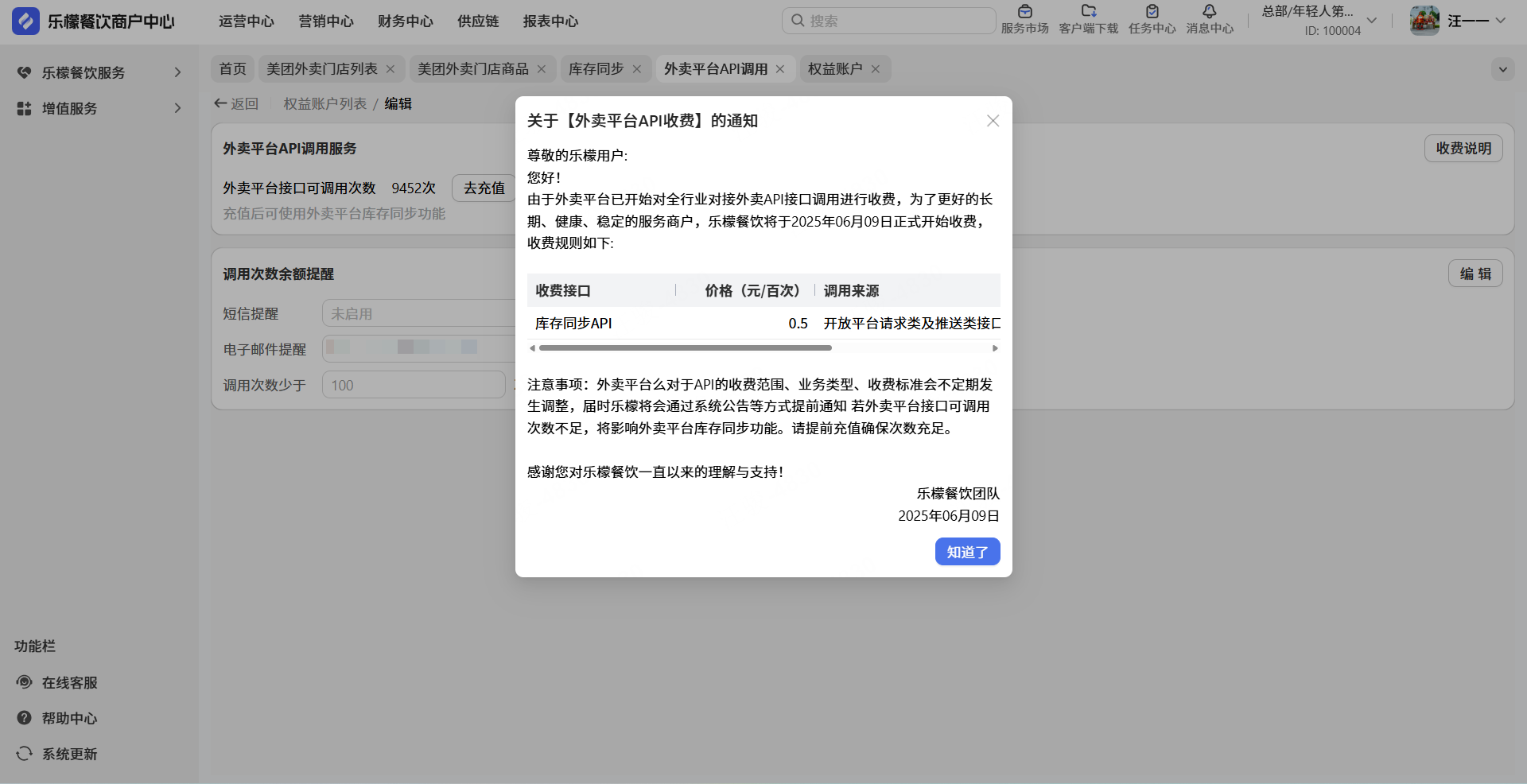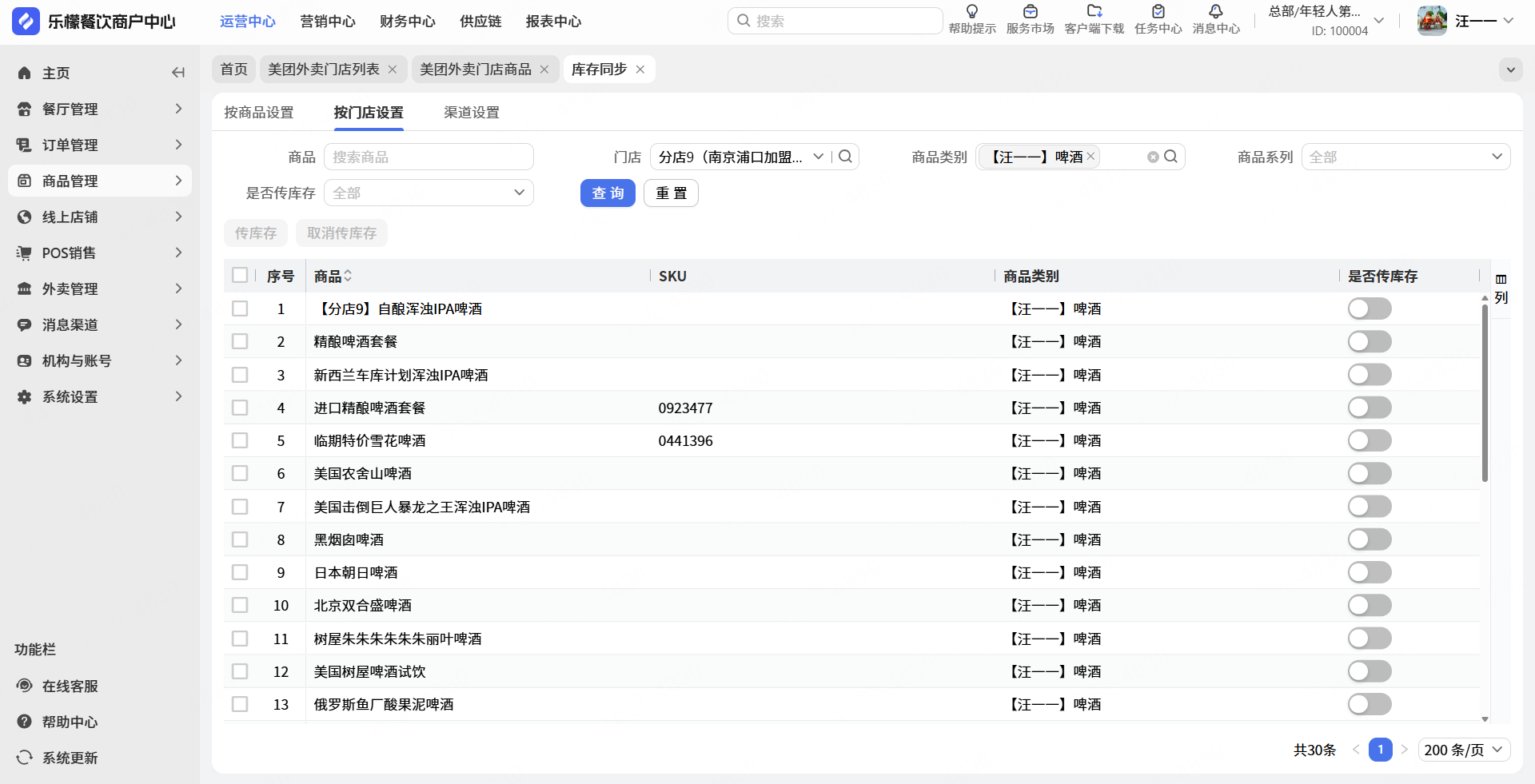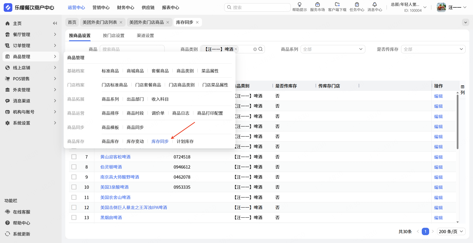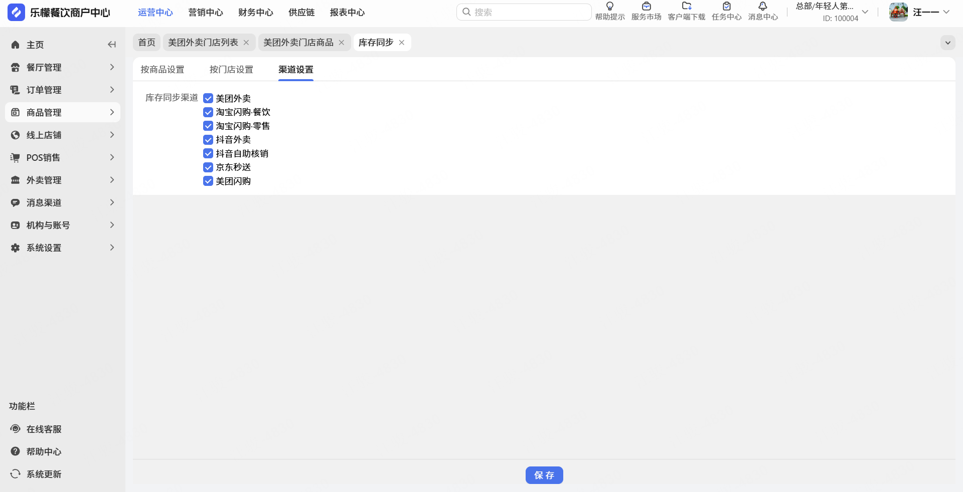 需要开启美团外卖、淘宝闪购.餐饮的商品库存同步功能