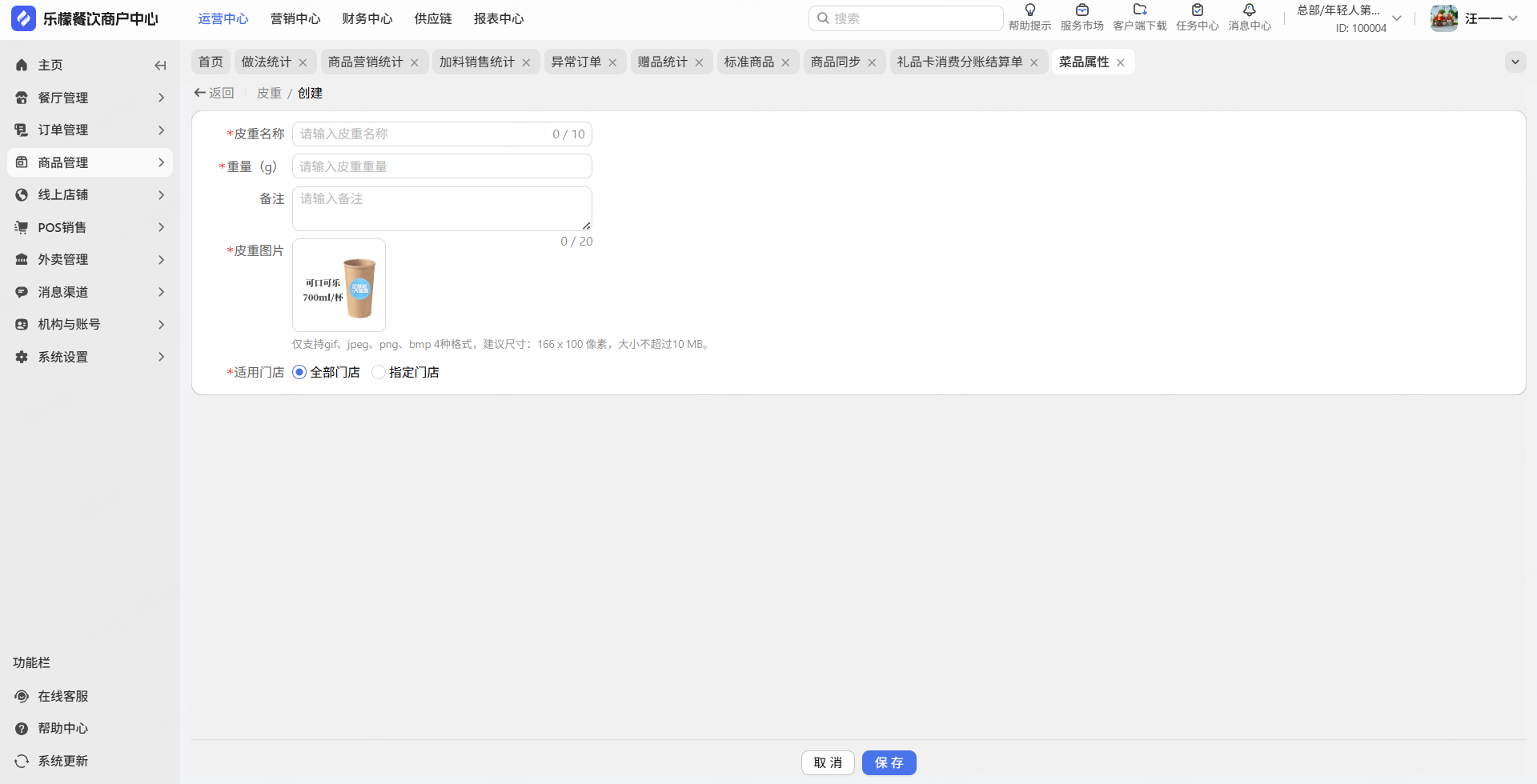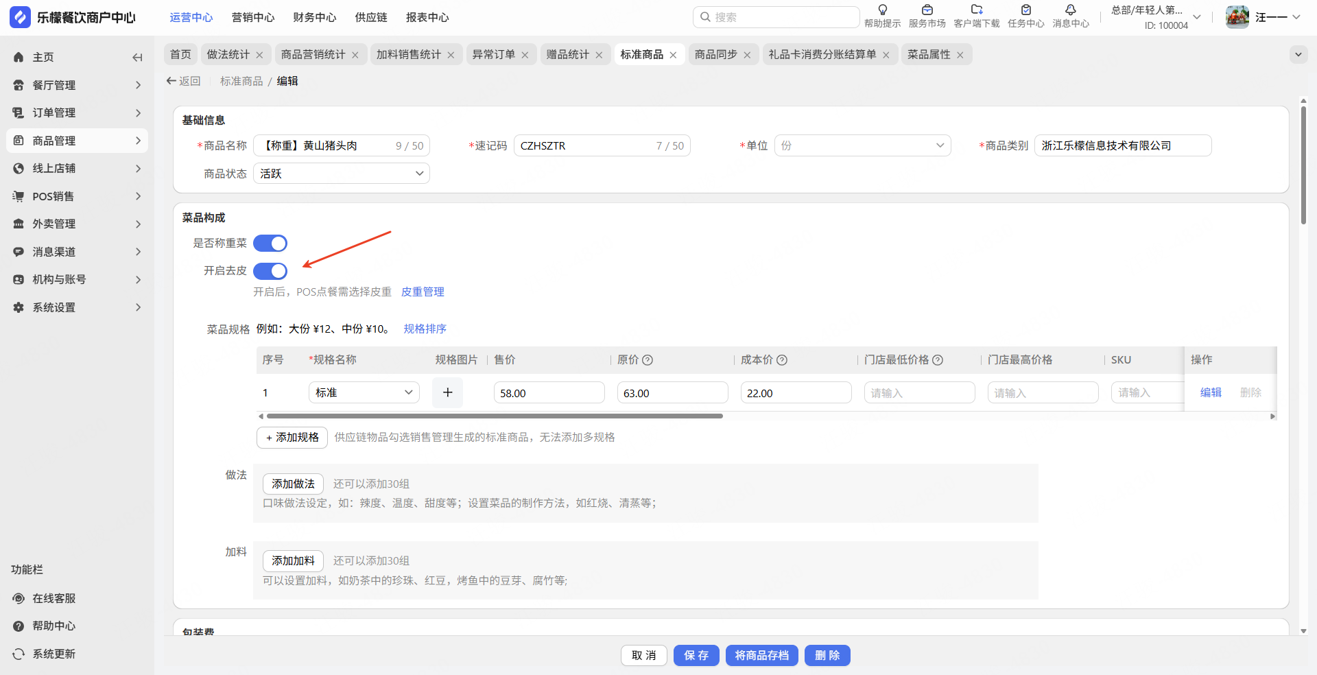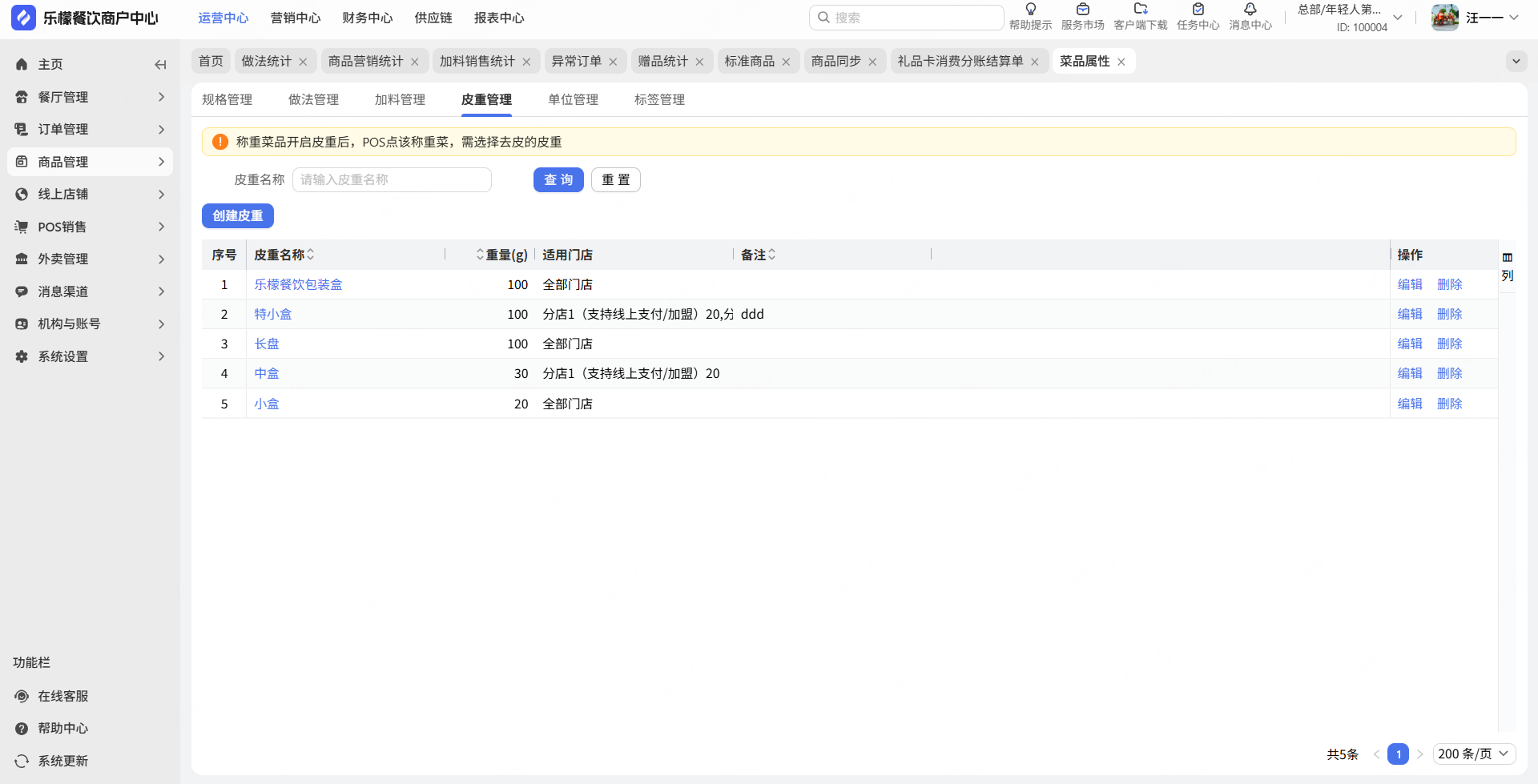 2.商品资料开启称重商品模式下,增加是否开启去皮功能