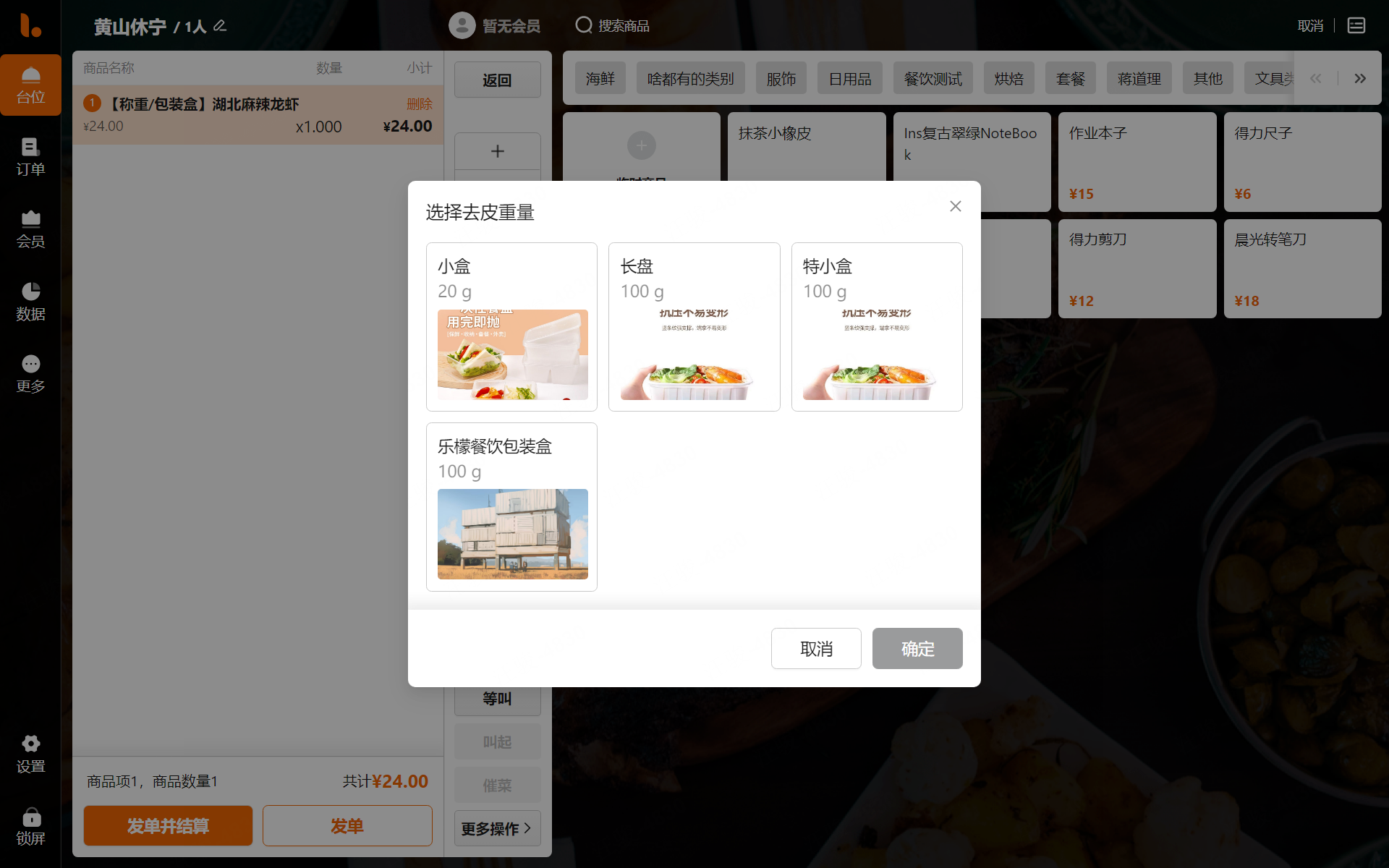 3.POS端称重商品选择商品确认后,选择包装盒(非必选),仅展示可扣减的包装盒(包装盒重量小于称重重量)选择后扣除对应的包装盒重量