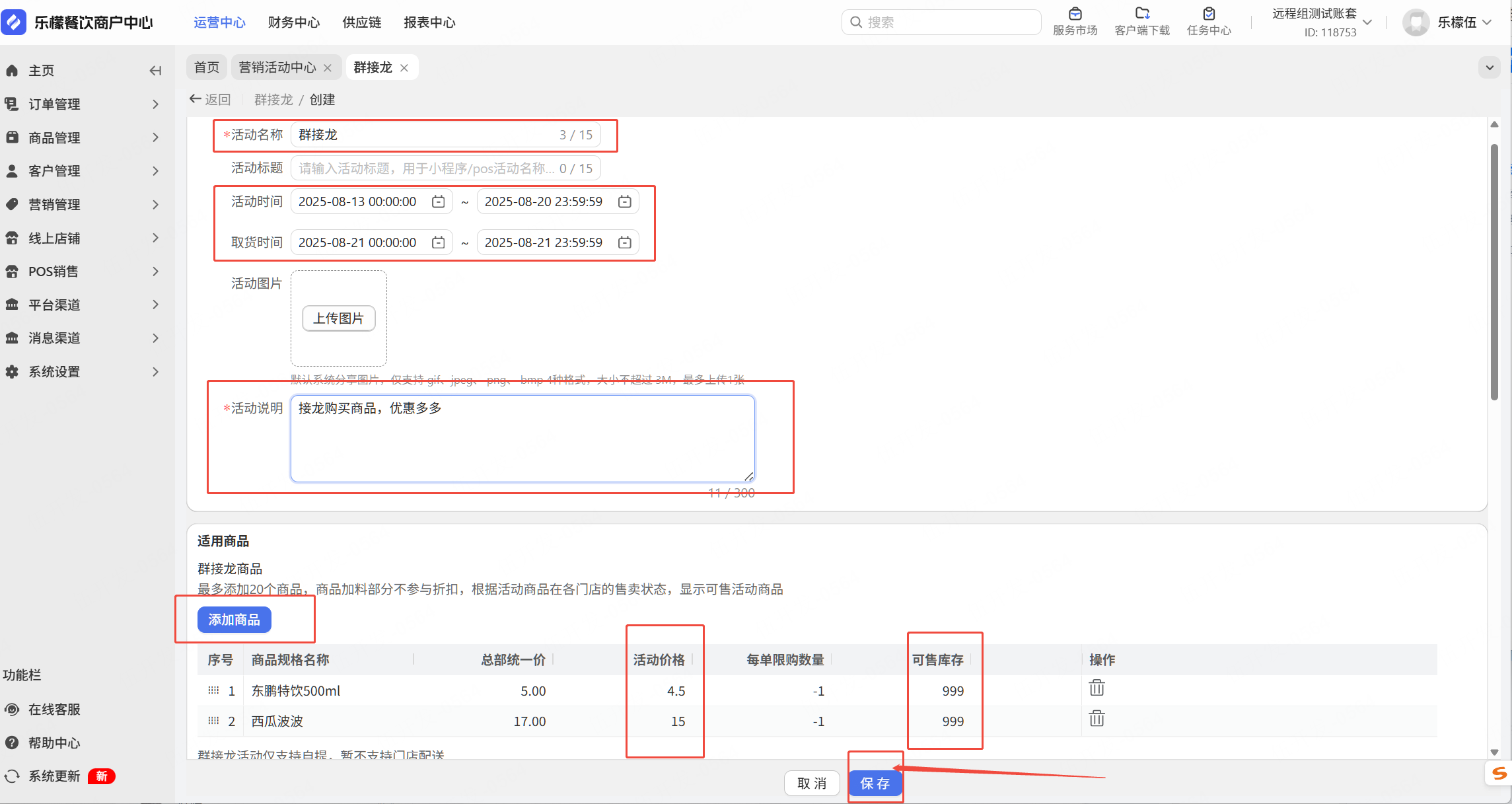 营销管理-管理中心-群接龙-创建群接龙将活动名称输入:群接龙。活动时间和取货时间设置好,活动说明填写:接龙购买商品,优惠多多。点击添加商品,选择好接龙的商品,设置好活动价和可售库存,保存即生效。