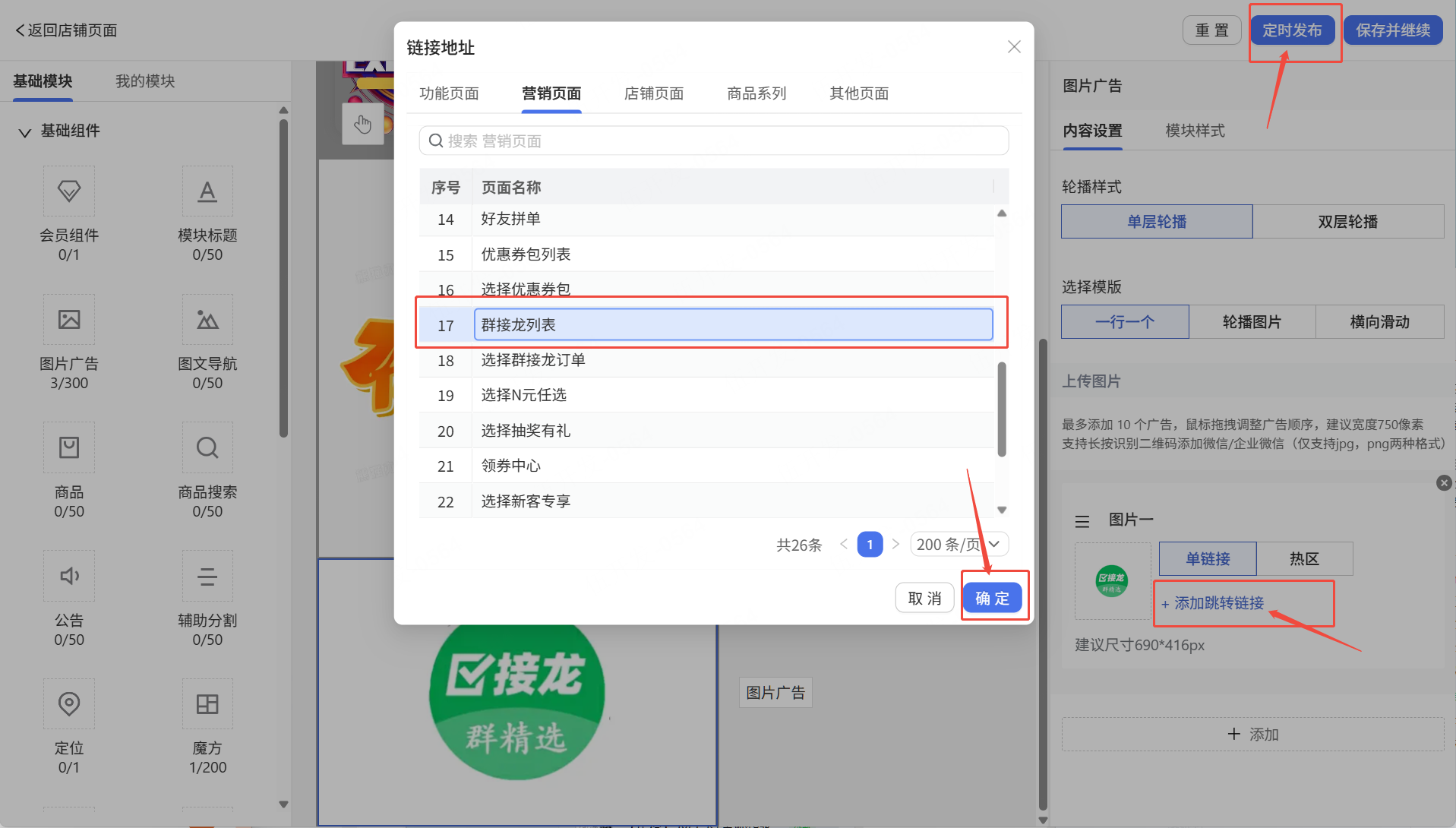 线上店铺-小程序管理-店铺装修,然后选中图片,点击跳转连接。在营销页面,选择群接龙确认。定时发布。