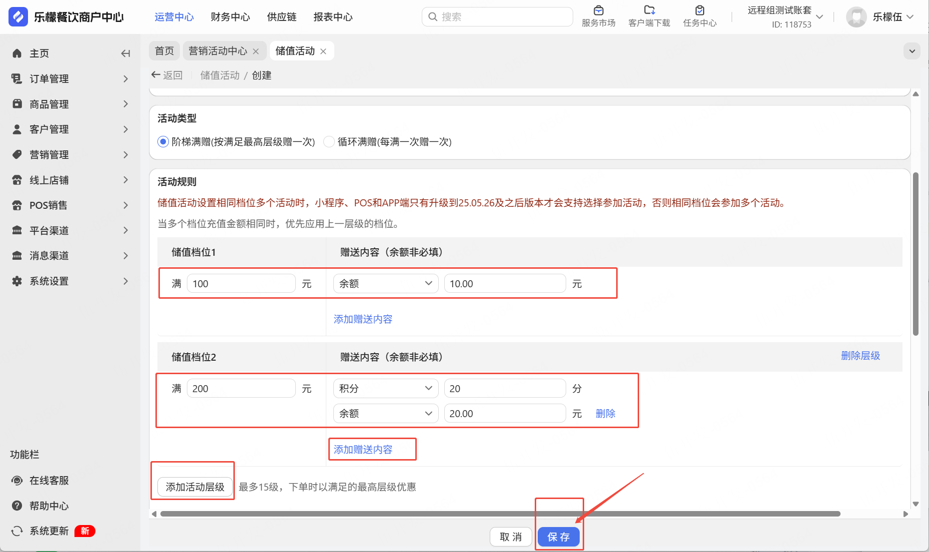选择阶梯满赠后设置,满100送余额10,满200送余额20和积分20,可以点击添加赠送内容,添加其他赠送的内容等。添加活动层级,可以设置下一个储值档位。保存后活动生效
