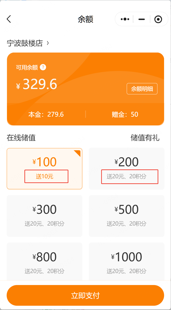 商家储值时同一档位会有多层级活动让客户选择,比如储值100送10元赠金。储值200送20元,20积分