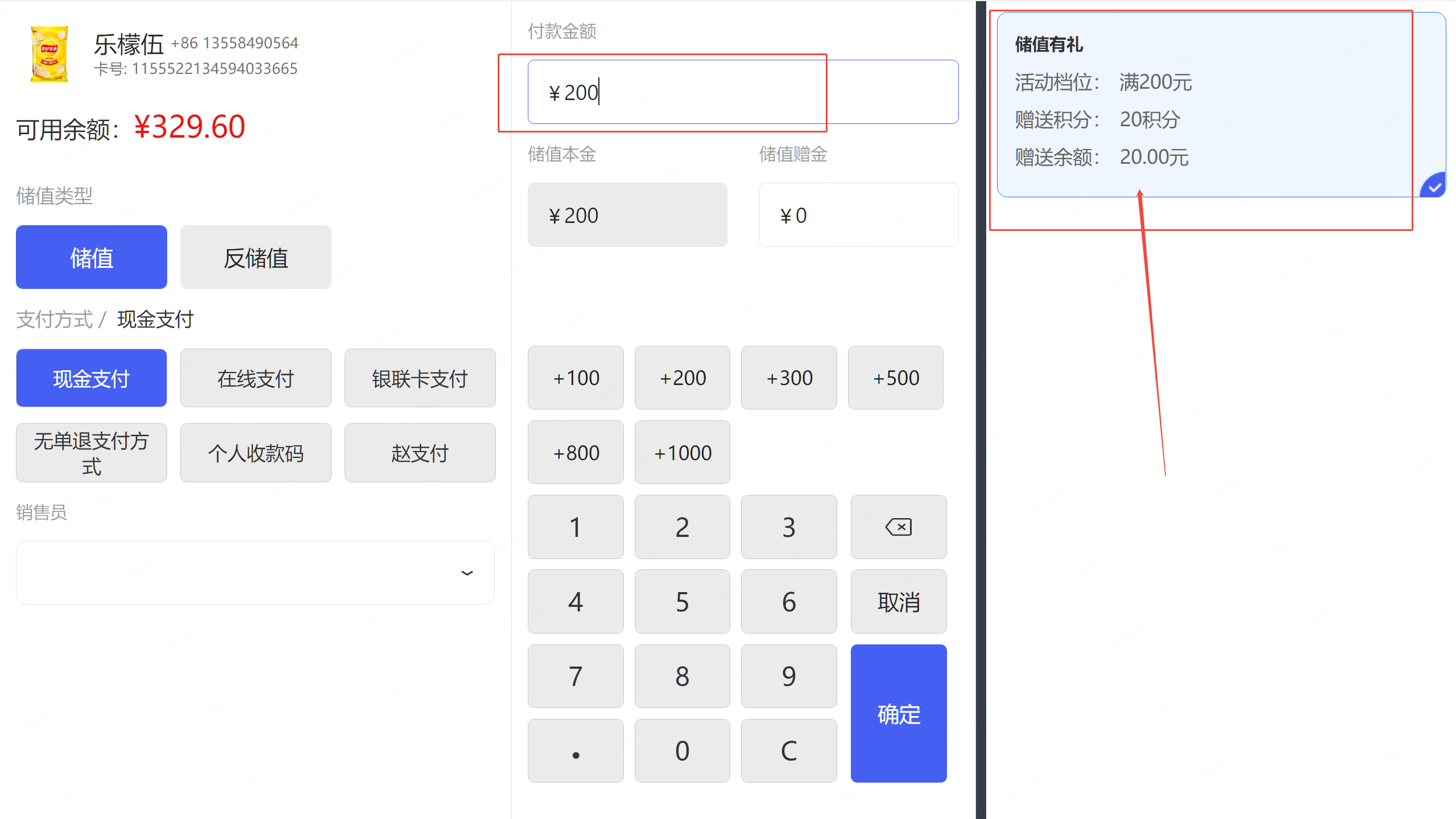 在前台收银系统-会员储值-当满足储值金额后,赠送活动就会生效
