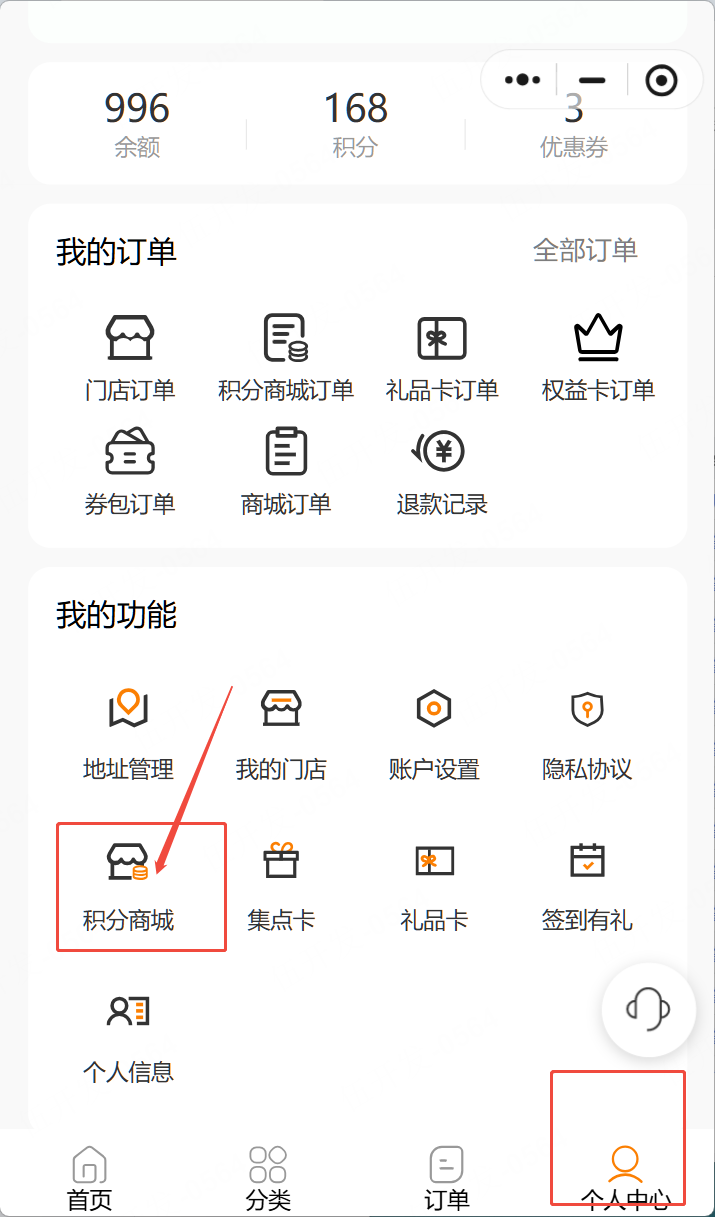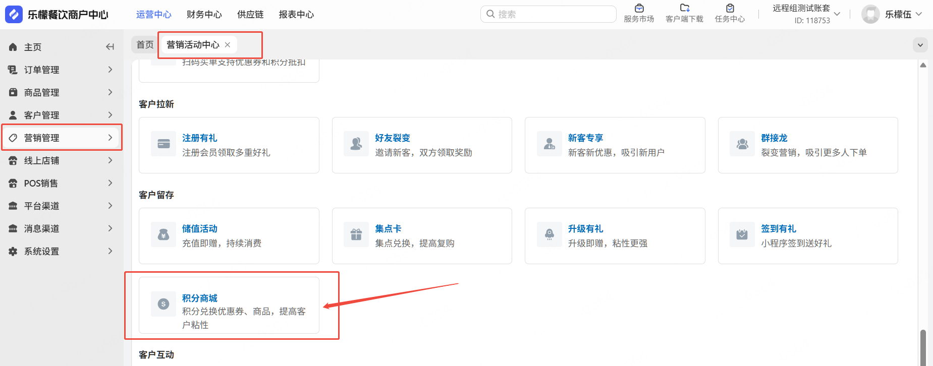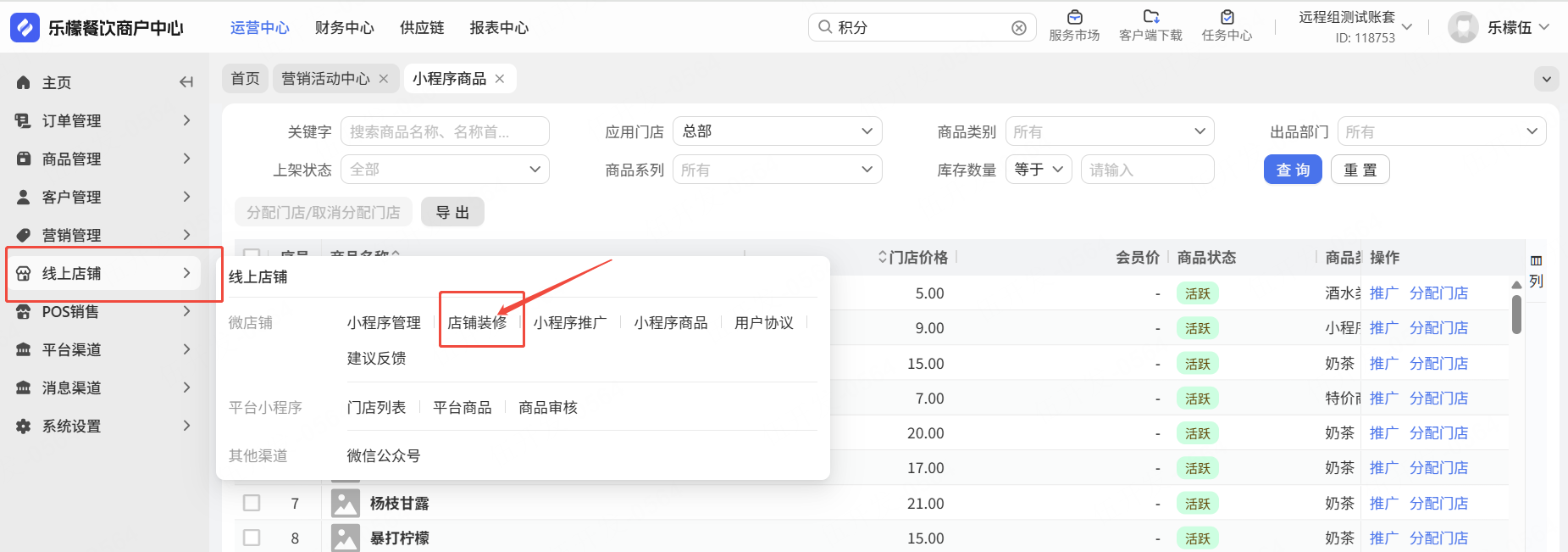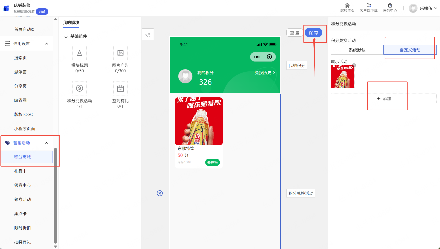 然后线上店铺-店铺装修-下滑找到积分商城-选择自定义活动,将东鹏特饮活动选择保存