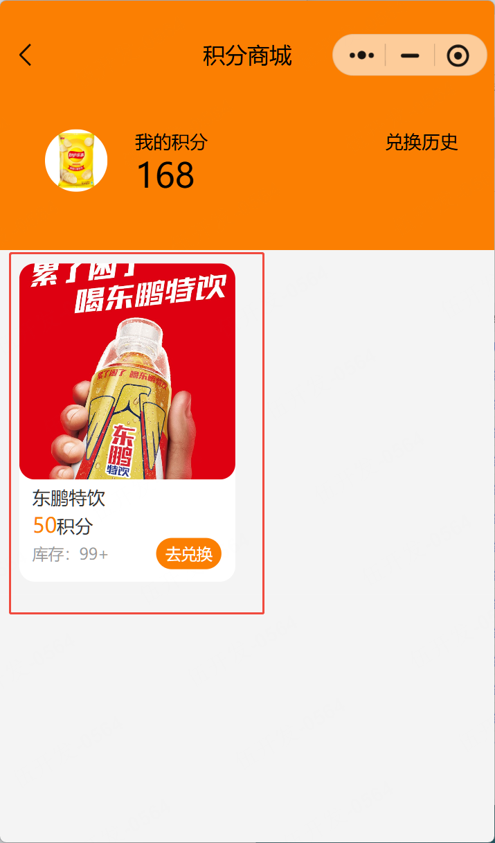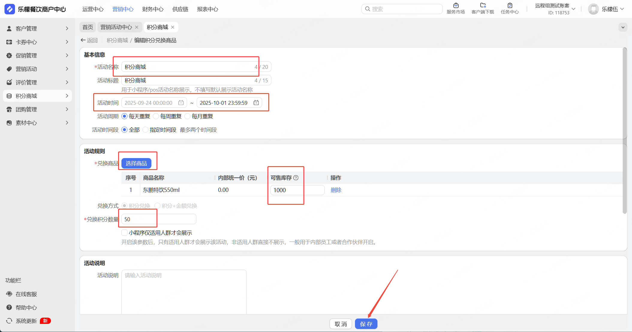 活动名称输入:积分商城 ,活动时间设置好,选择商品将东鹏特饮500ml选入,可售库存为1000,然后设置50积分可以兑换一瓶东鹏特饮,保存