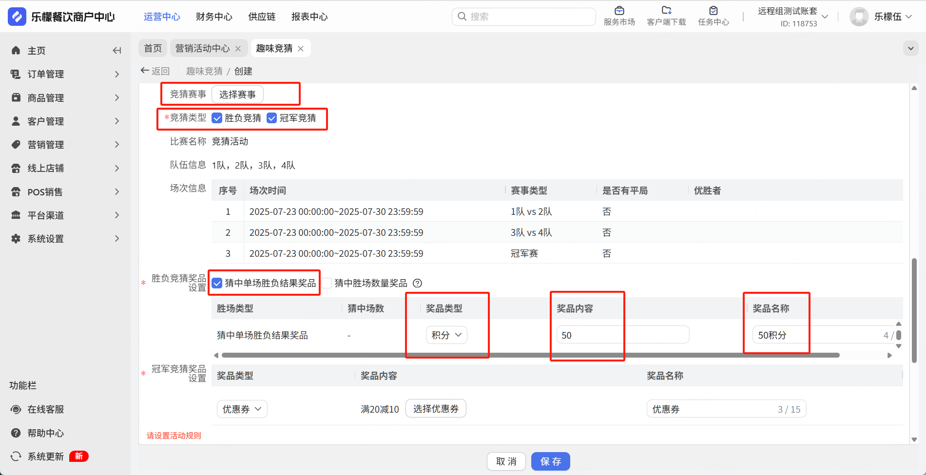 然后将赛事,选择好,将胜负和冠军竞猜勾选,然后勾选胜负结果奖品,将竞猜的奖品选择好,奖品名称填入,保存