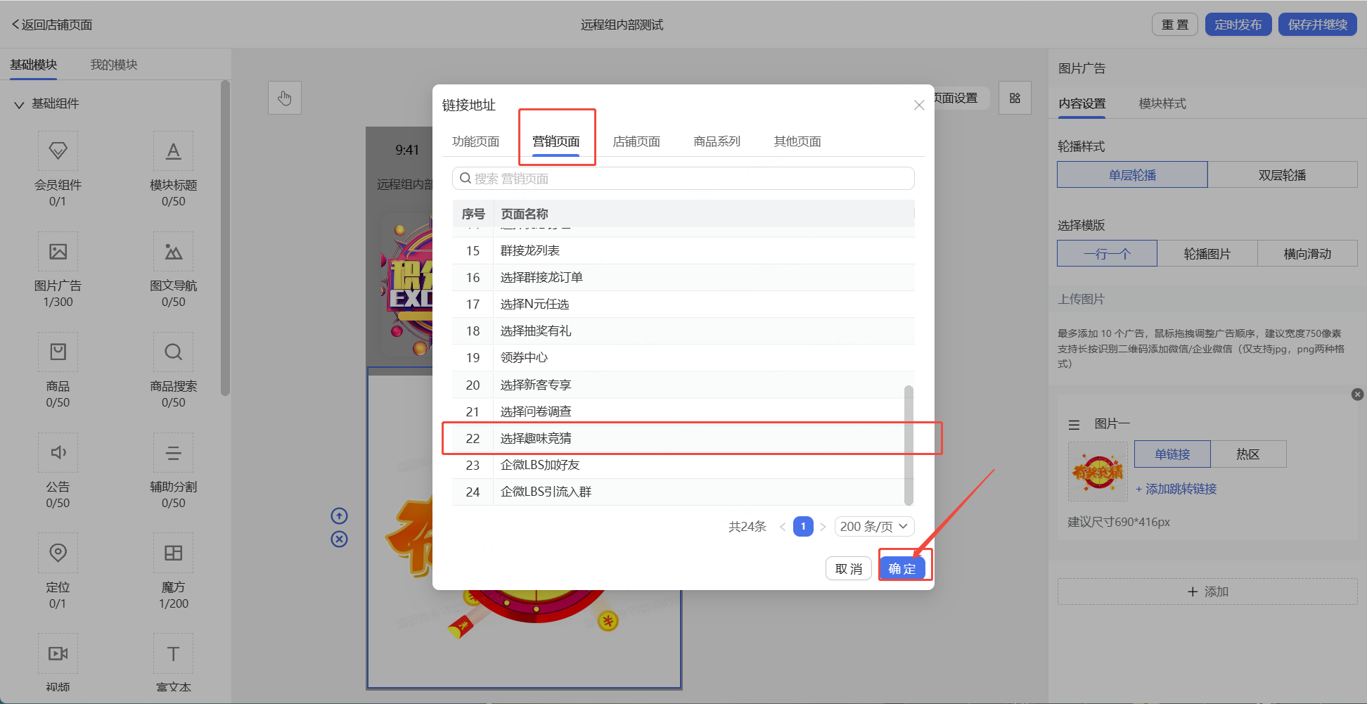 选择营销页面,下滑找到趣味竞猜,选择后点击确认