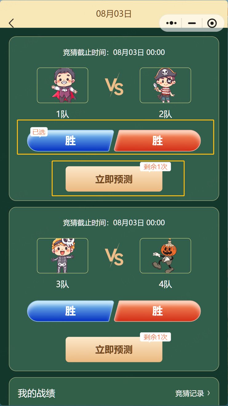 3.打开小程序,然后点击设置了趣味竞猜活动的图片,选择队伍后,点击立即预测