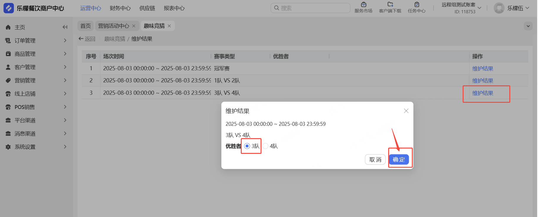 4.回到网页维护比赛结果,定义胜利的队伍,若猜中则会给竞猜客户发放对应奖励