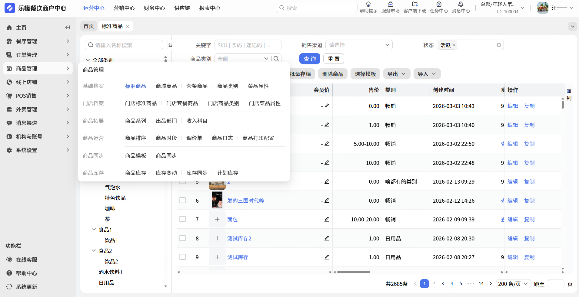 👉【操作路径】:打开【乐檬餐饮商户中心】,依次点击:①商品管理-②标准商品
