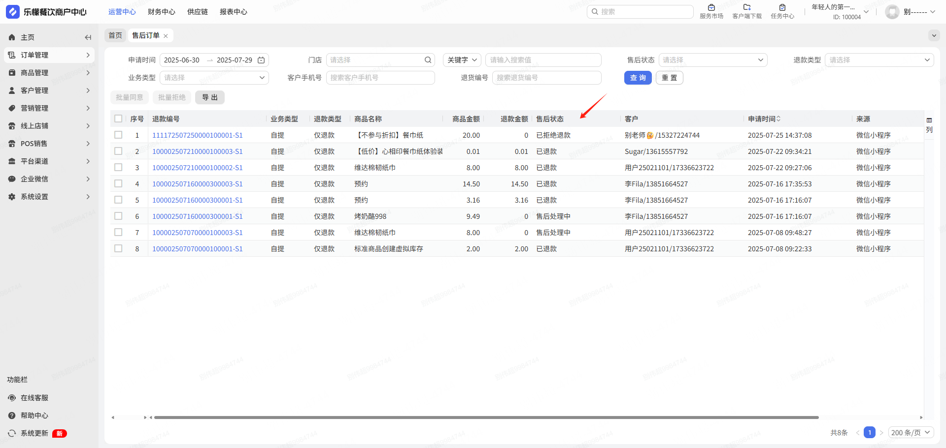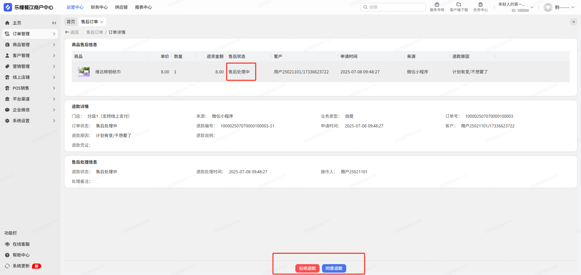 订单来源:小程序自提 /配送订单,顾客申请退货后生成售后订单,商家可操作同意退款 /拒绝退款