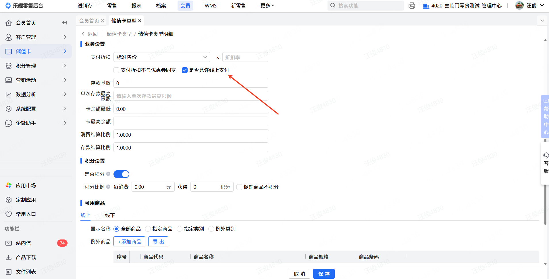 注意:如果需要使用该功能,需要在【乐檬零售】储值卡类型的详情页勾选:是否允许线上支付。