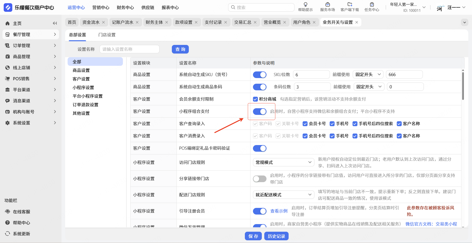 2.如果希望在微信小程序使用该功能,需要在【乐檬零售】储值卡类型的详情页勾选:是否允许线上支付。需要在【乐檬餐饮】开启组合支付