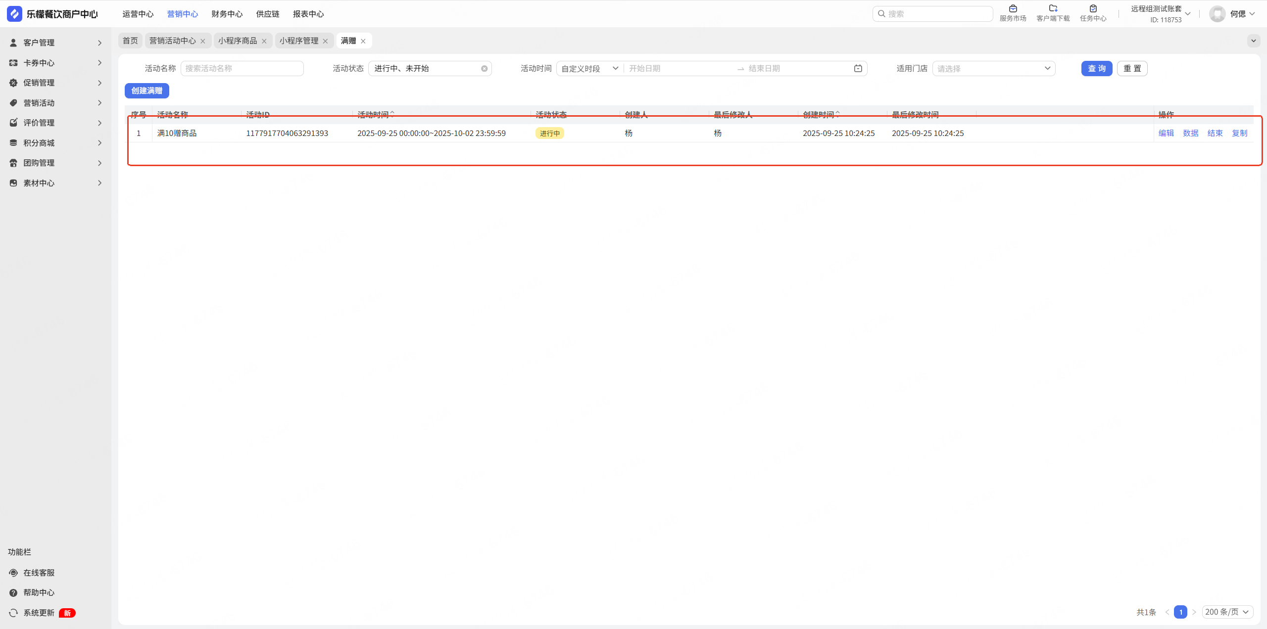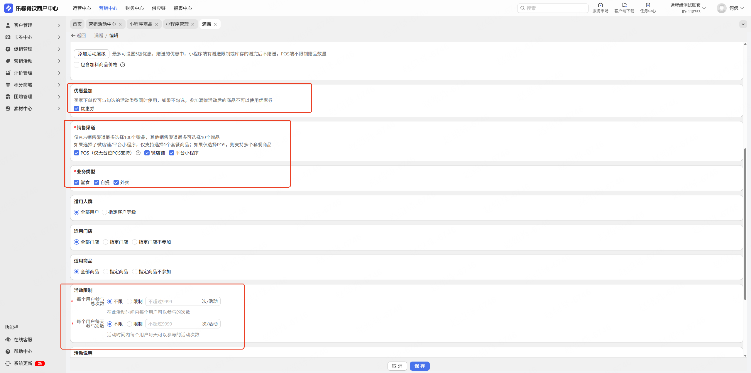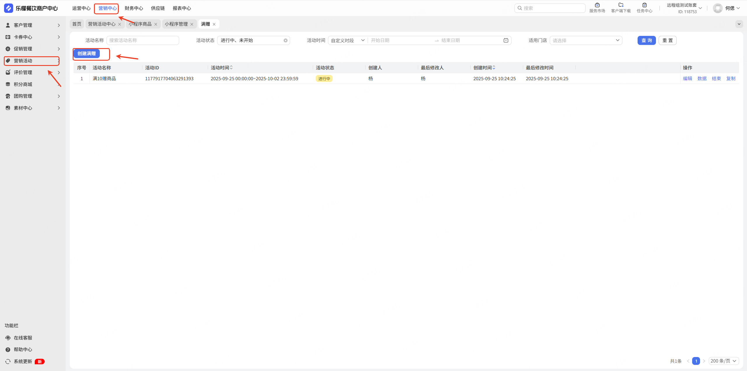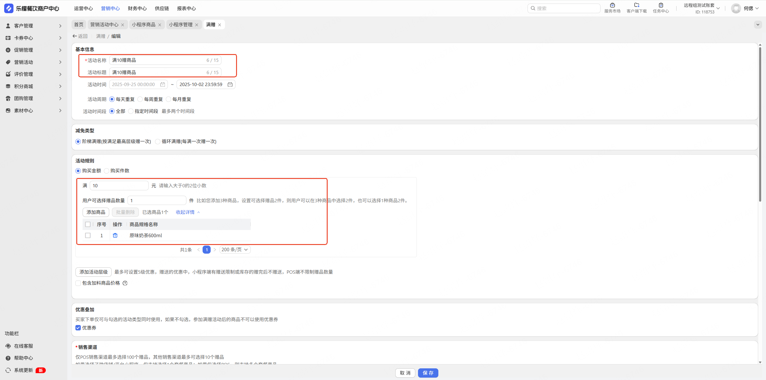 👉【操作路径】:后台——营销中心——营销活动——满赠