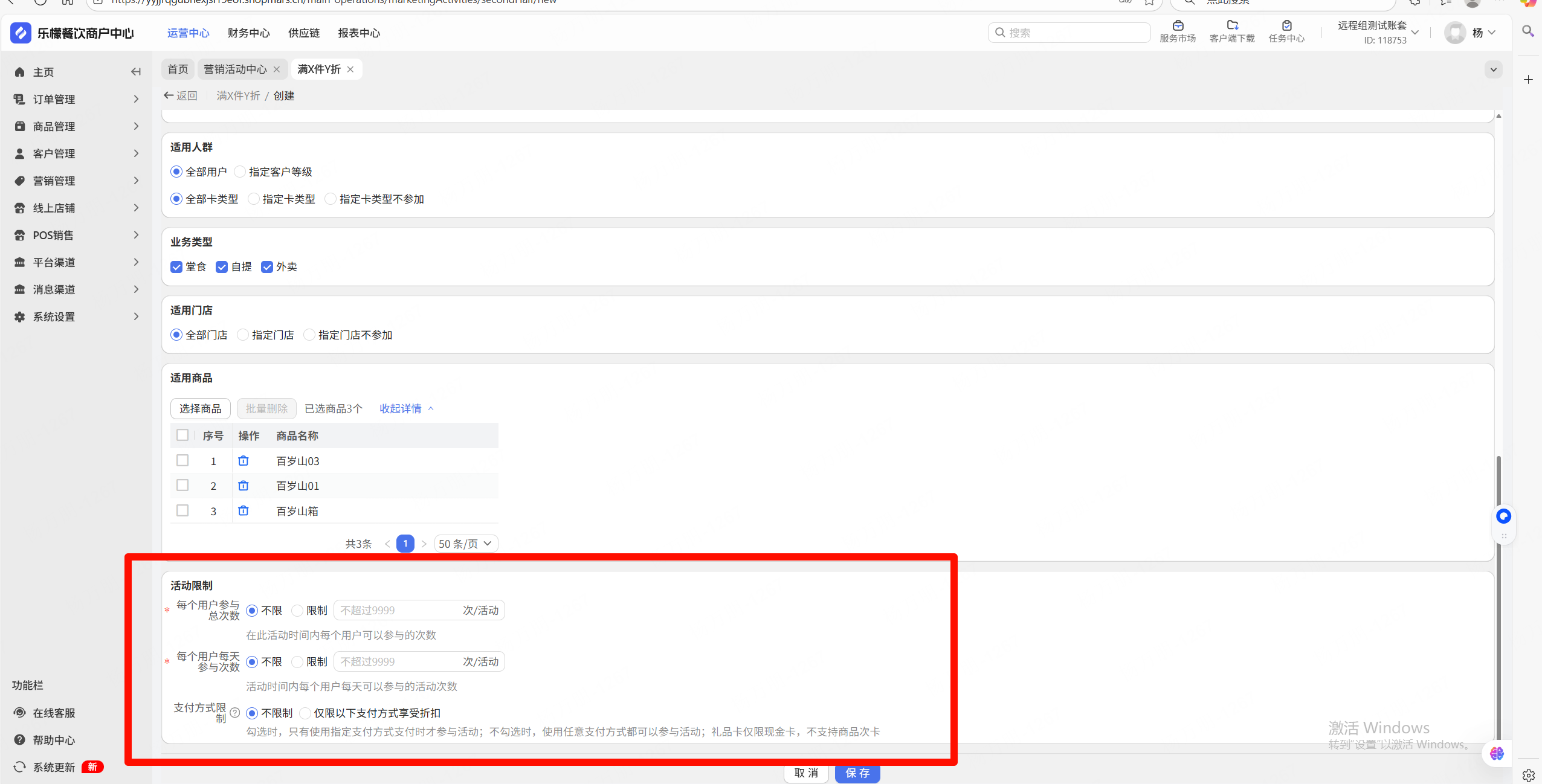 👉【操作路径】:设置销售渠道,适用人群,就餐方式,适用门店