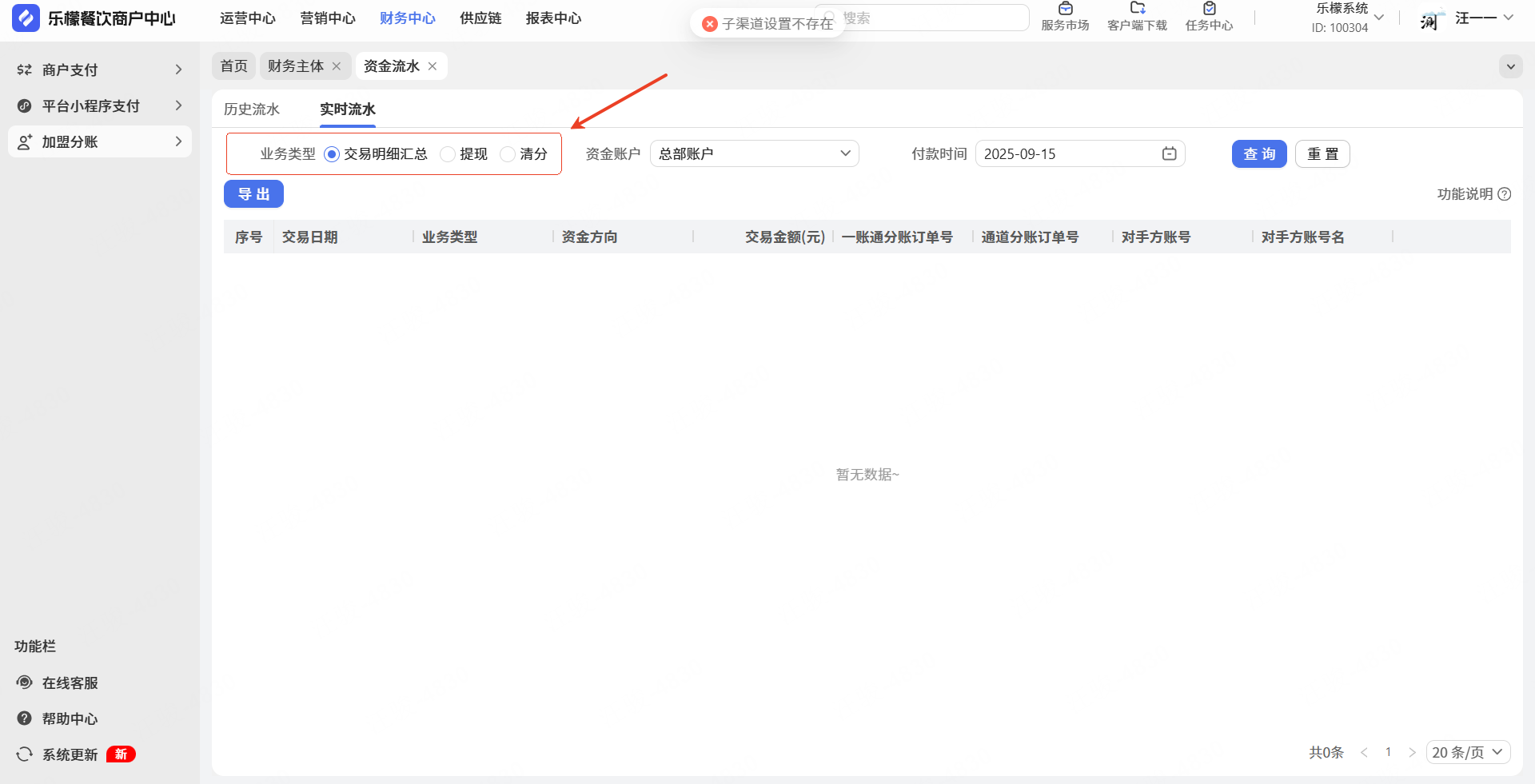 针对扫呗一账通平安通道,实时流水中业务类型直接展示,包括交易明细汇总、提现、清分