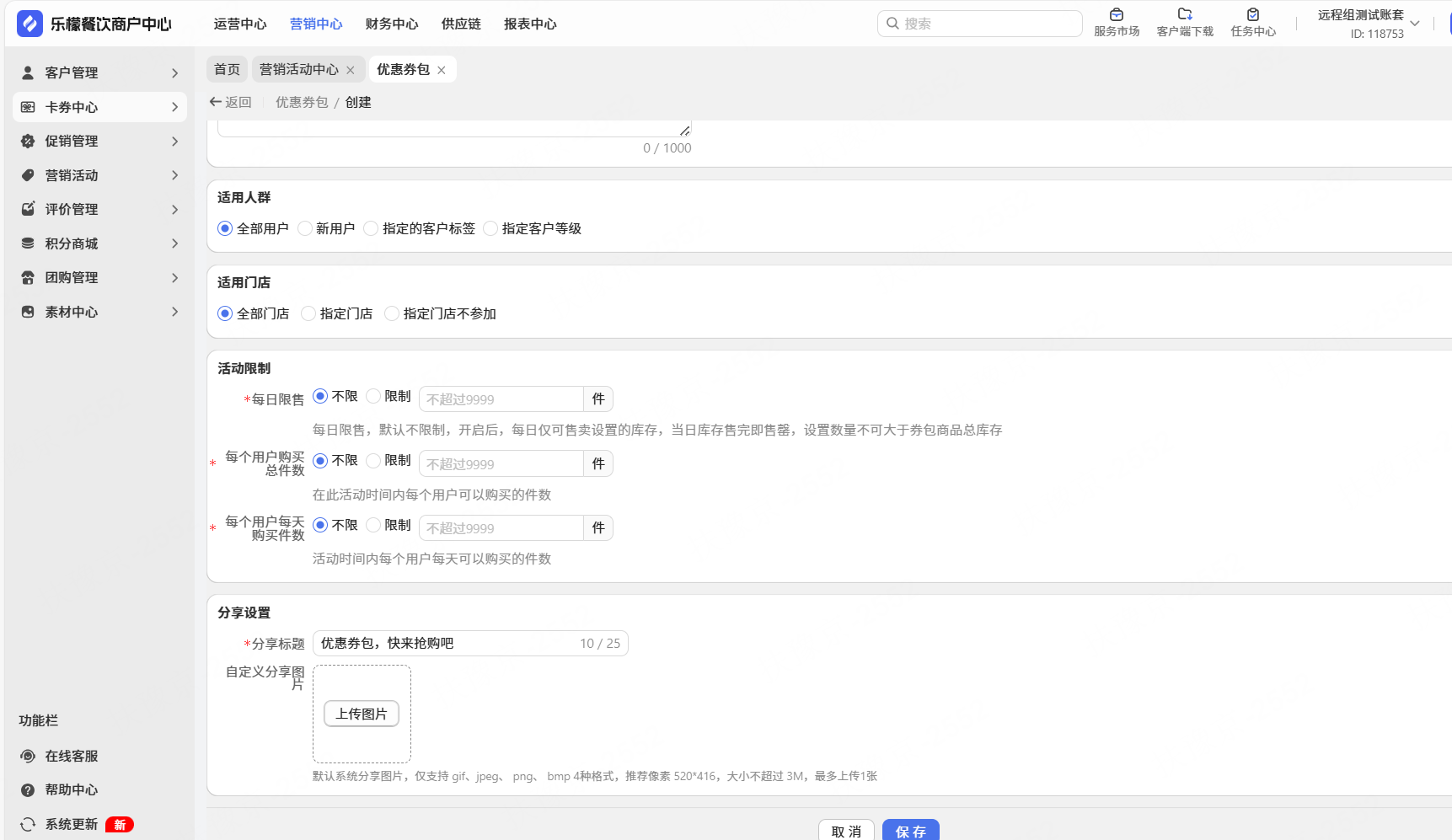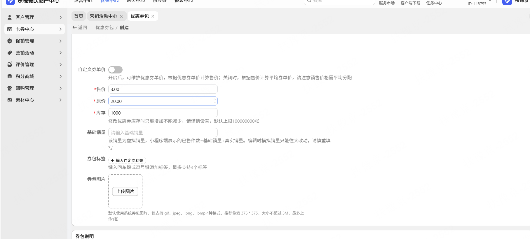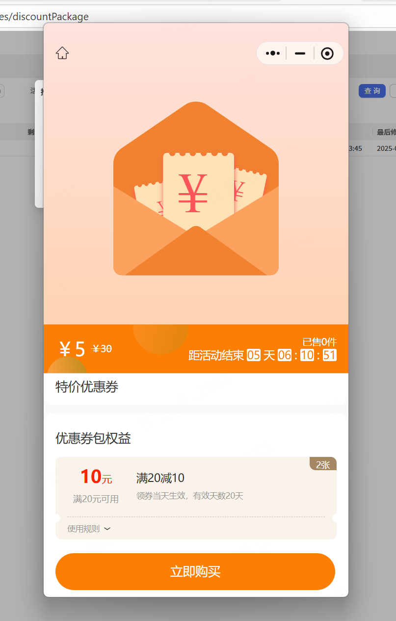 1.商家在后台设置好优惠券包活动后,会员可以在小程序购买优惠券包,购买后发放相应的优惠券。