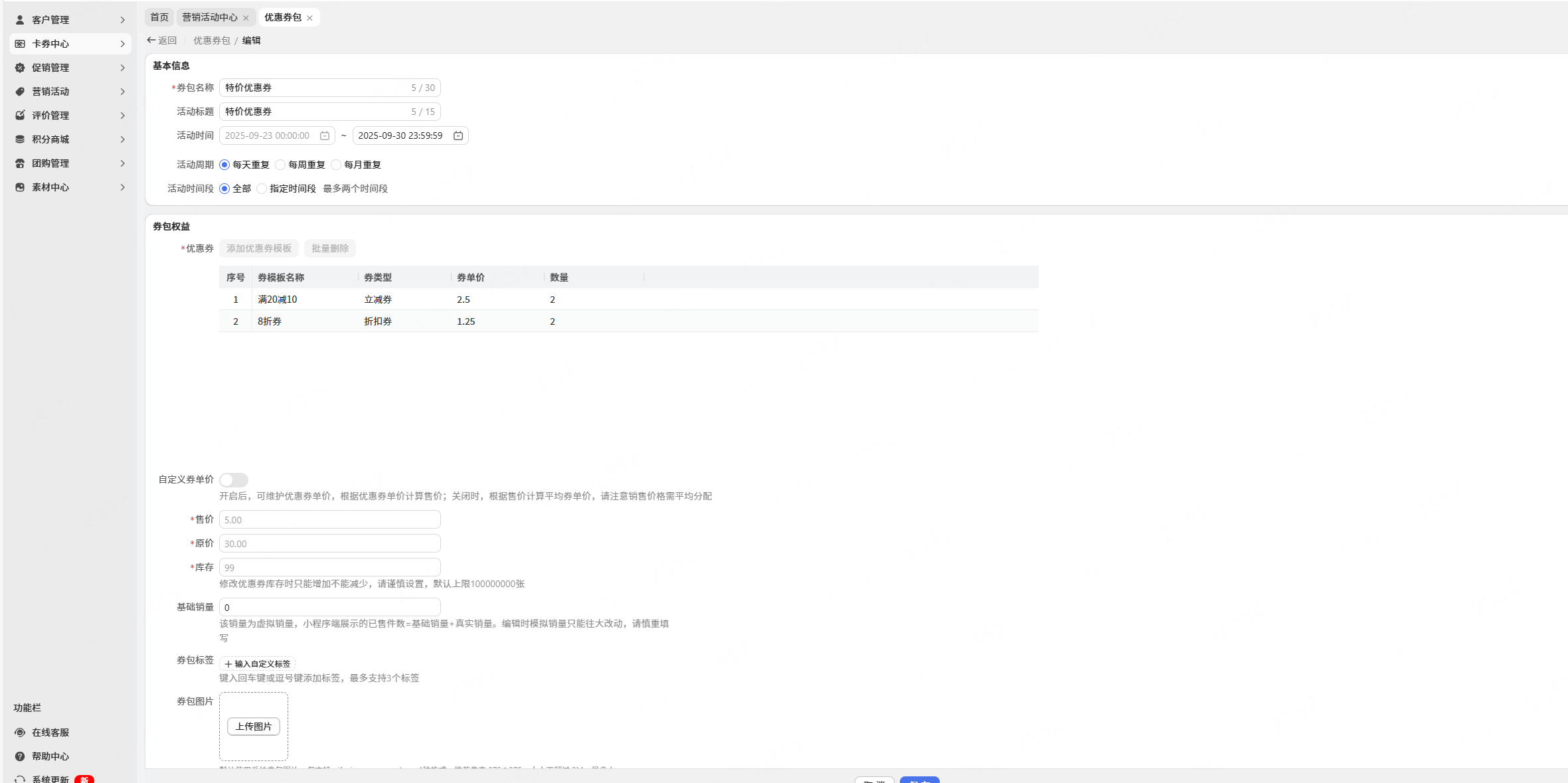 支持用户在小程序购买优惠券包,用户使用优惠券包的优惠券下单,提高商家销量。