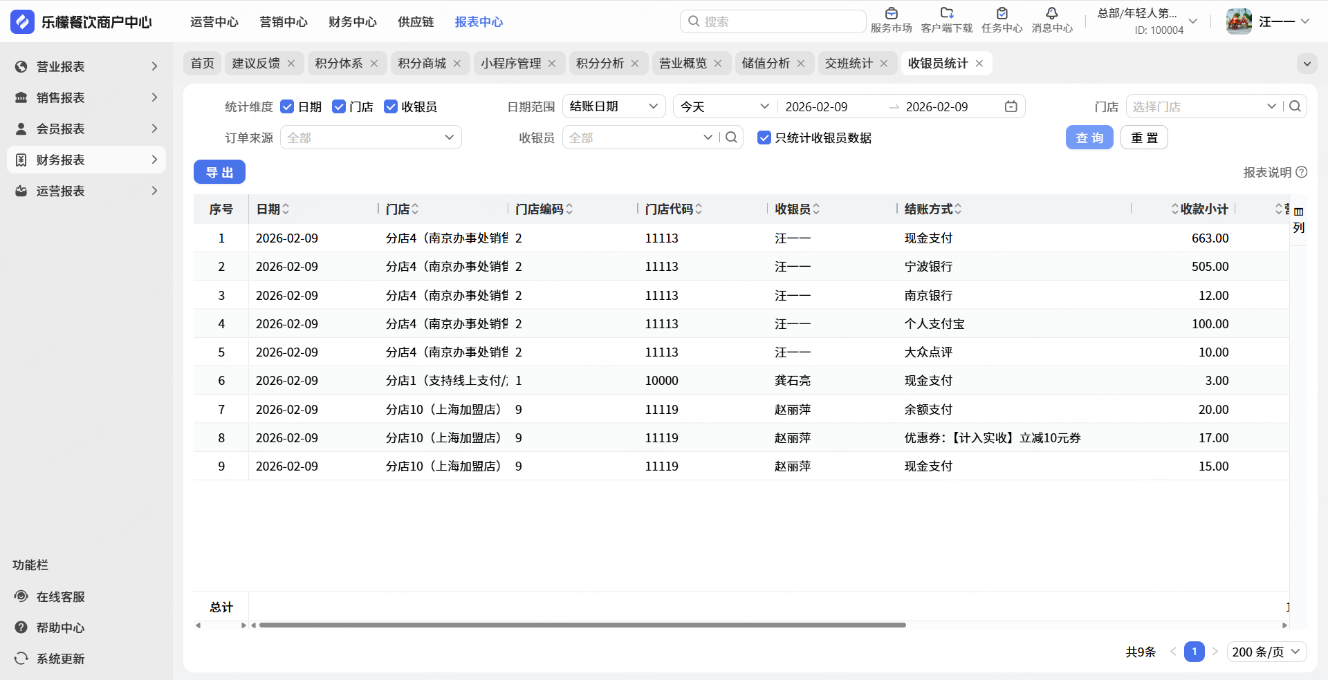1.收款小计:统计该支付方式所有业务类型的支付总和,包括:营业收入、储值、礼品卡、权益卡、挂账还款、订金收退、押金等。