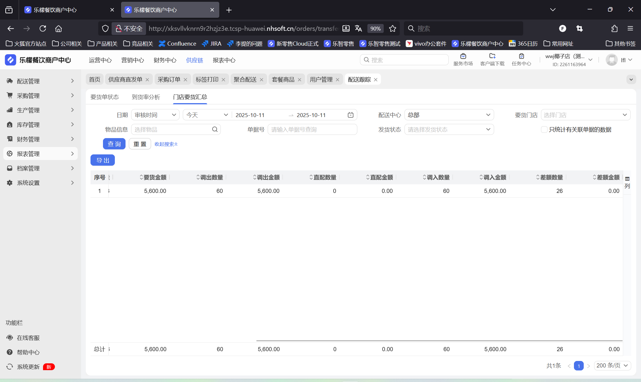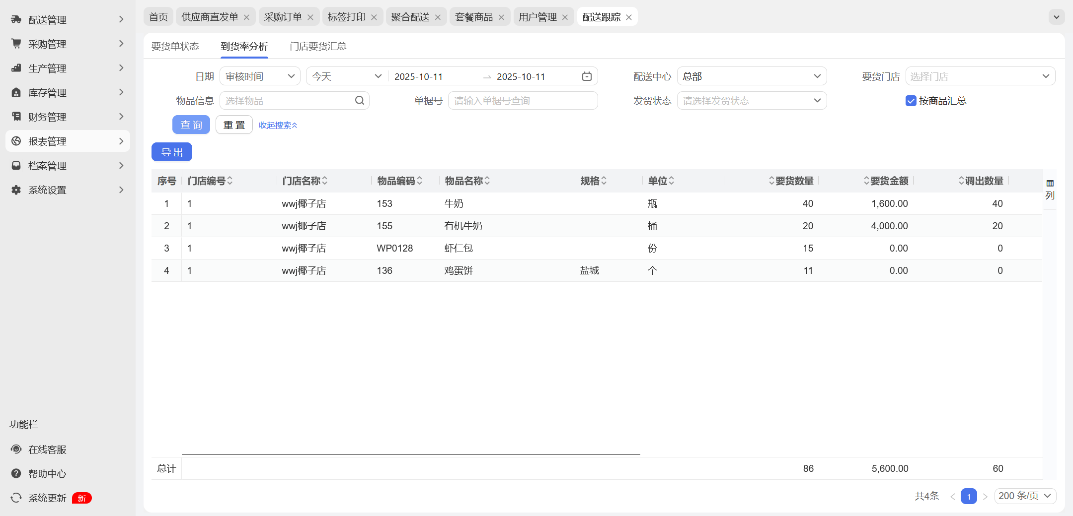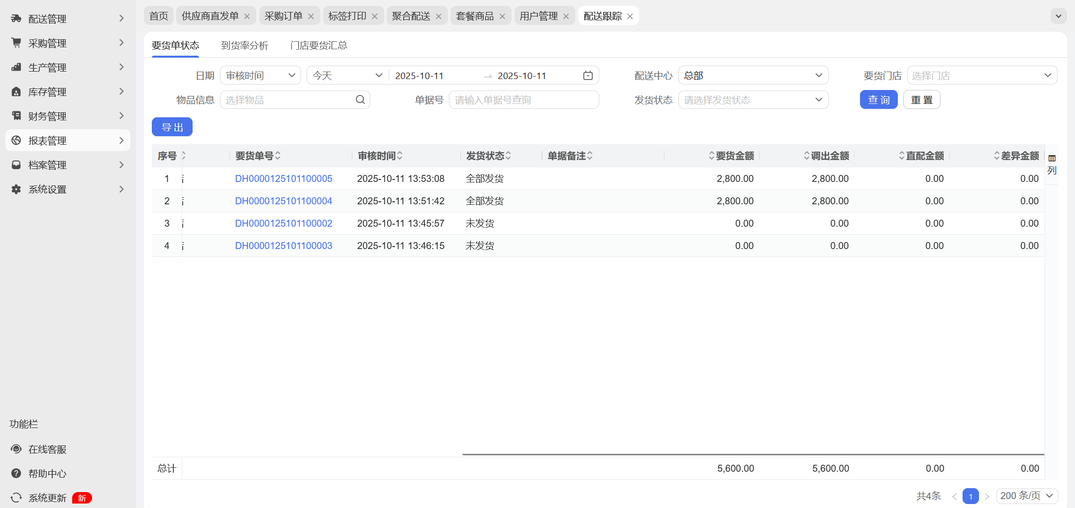 门店要货汇总,则按门店维度,查询要货数量/金额,发货数量/金额的数据与差异