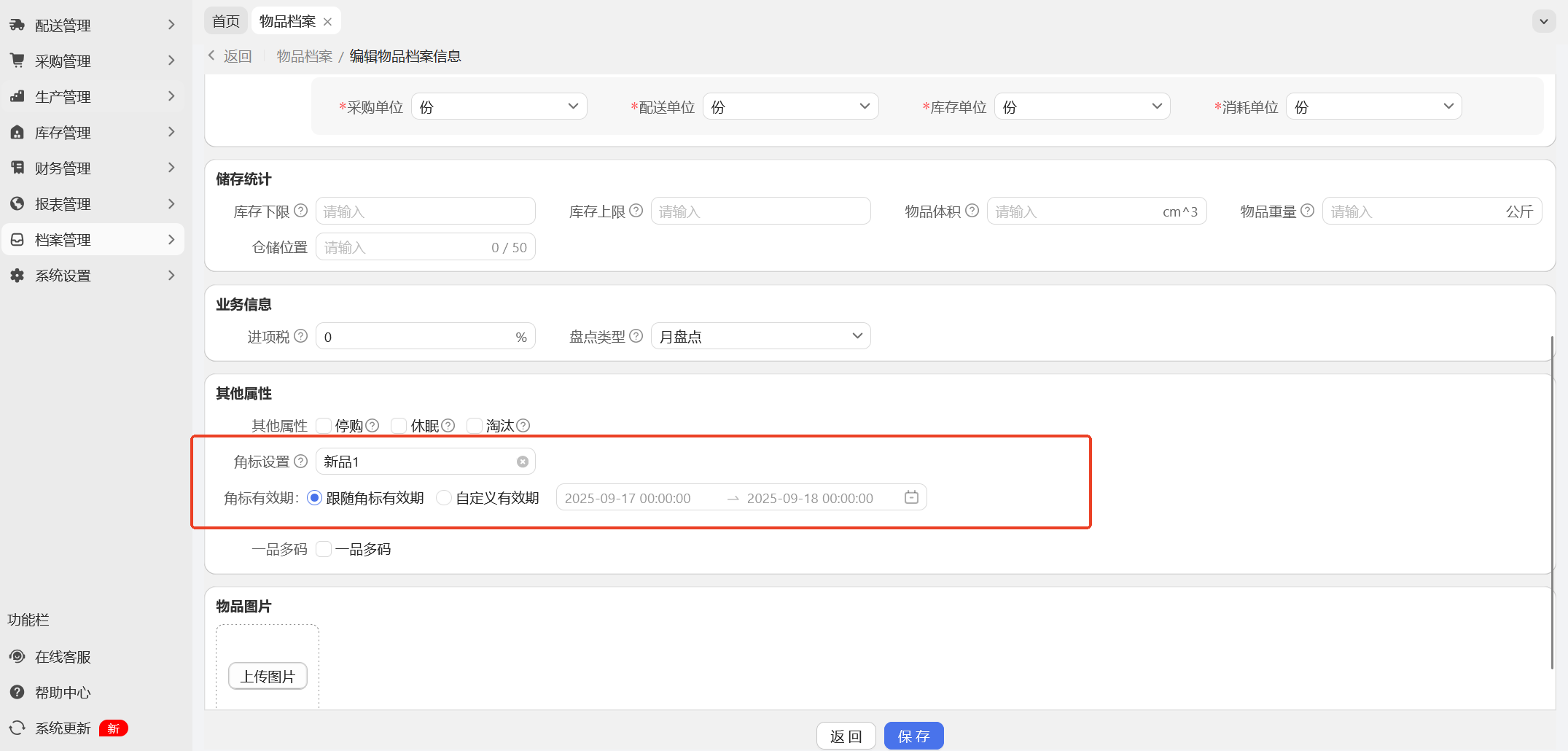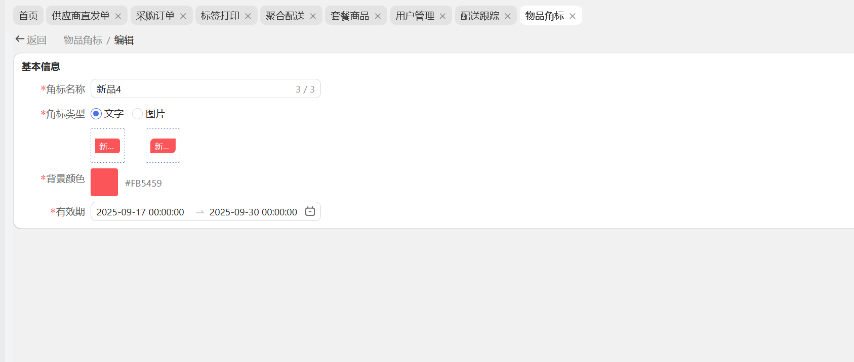 创建角标后,物品可设置角标,角标有效期可选择“跟随角标有效期”或“自定义有效期”