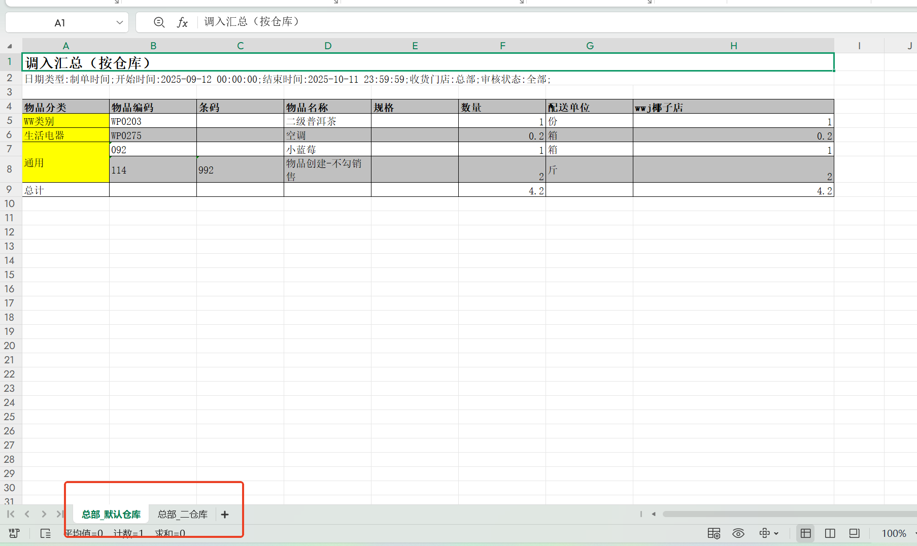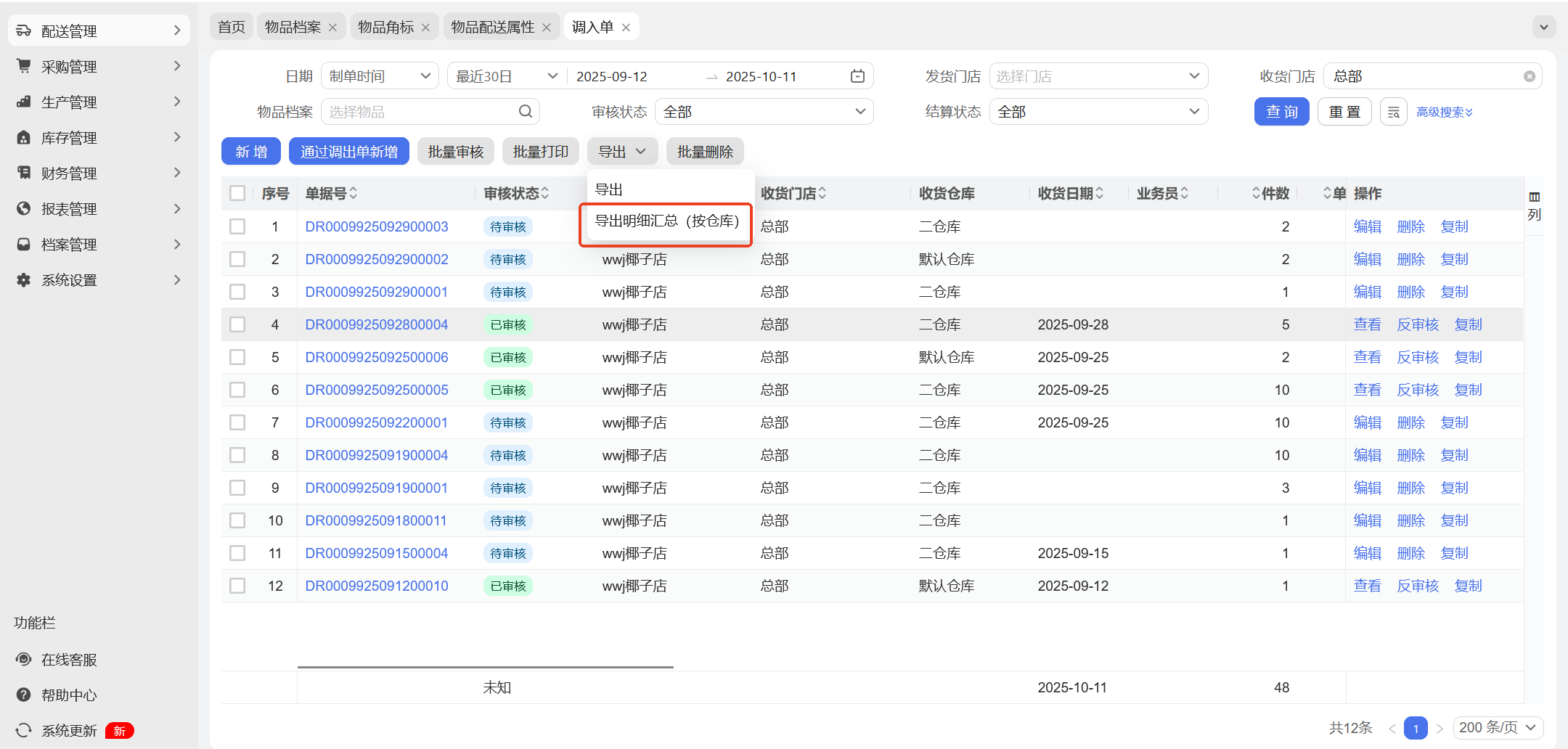 可进行导出明细汇总(按仓库操作),将门店调入数据,按仓库TAB导出