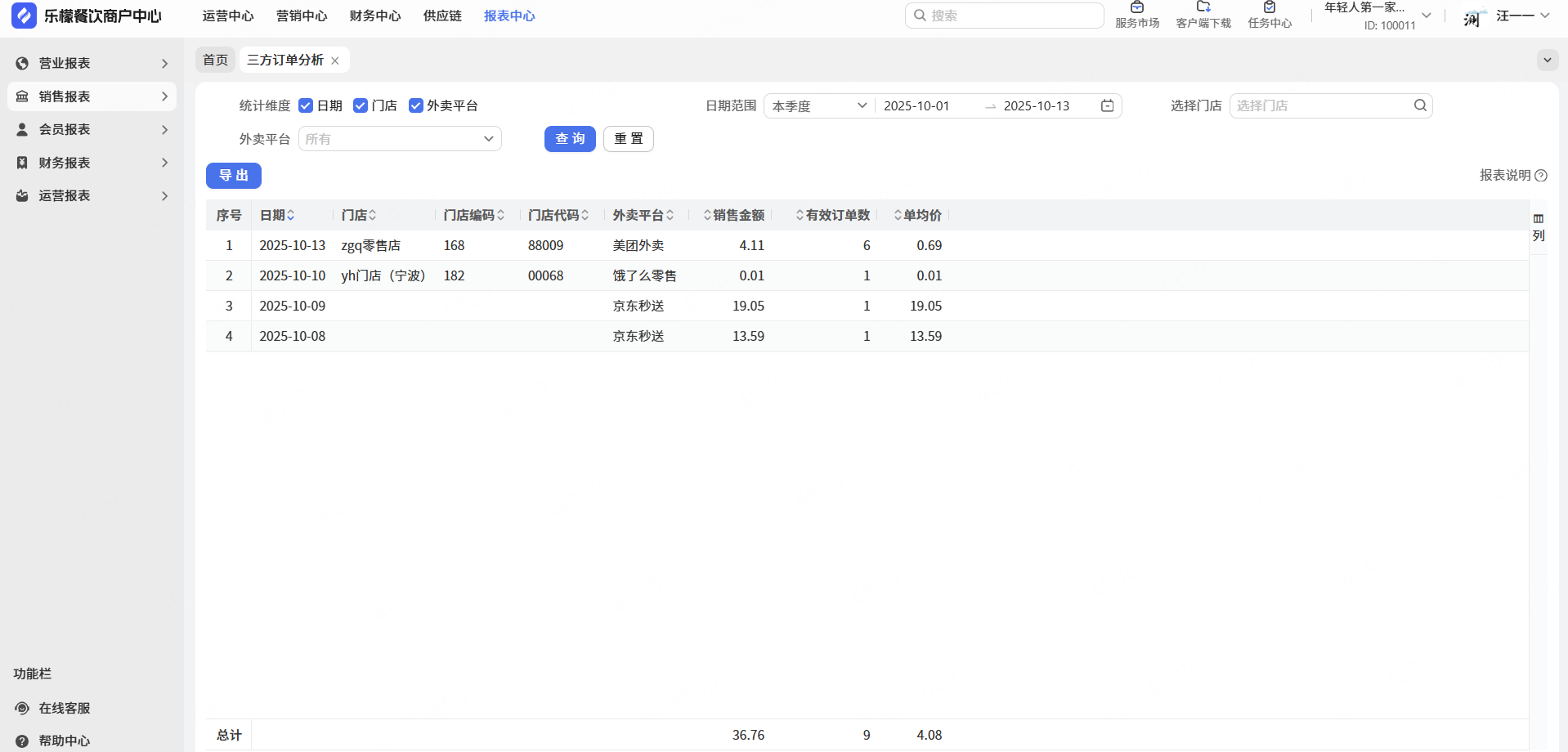 1.三方订单分析报表升级,去除之前的虚拟号展示,统计维度平铺展示,包括:日期、门店、外卖平台
