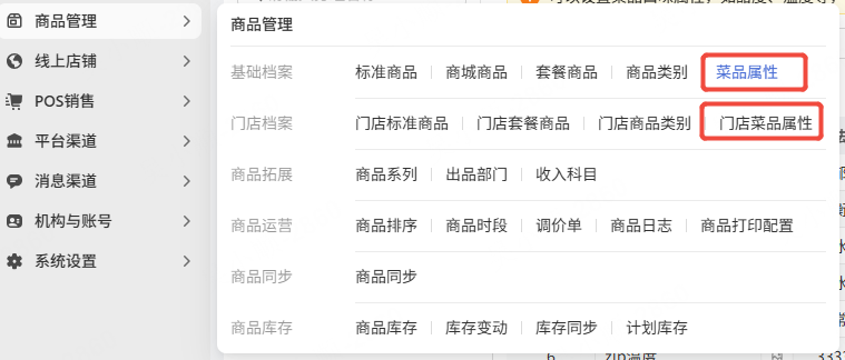 原“属性”,改名为“菜品属性”,菜单位置移到基础档案;