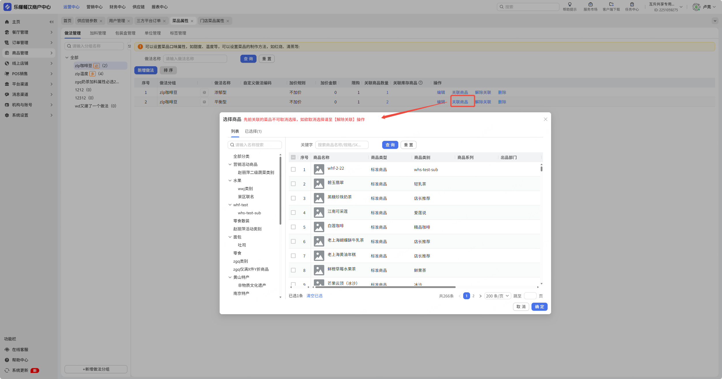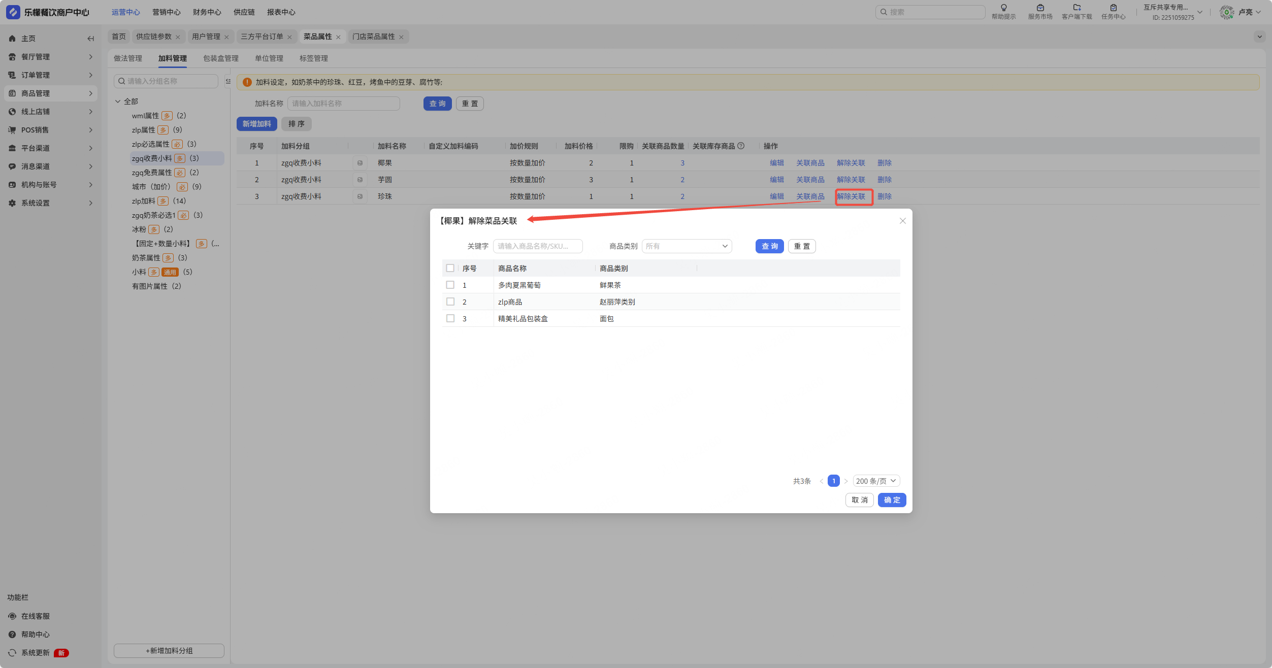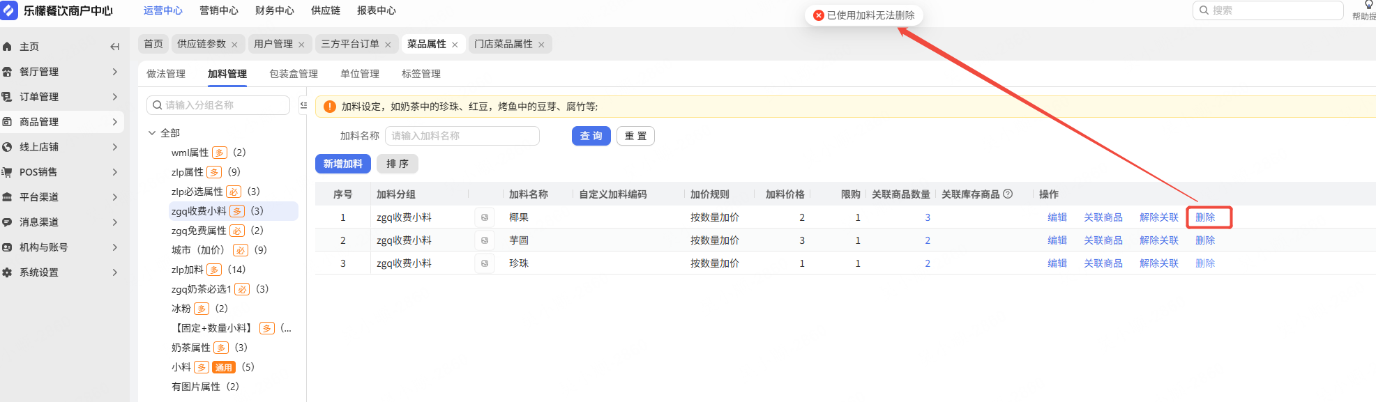 解除关联,选择商品去掉关联后,该商品不应用该加料。