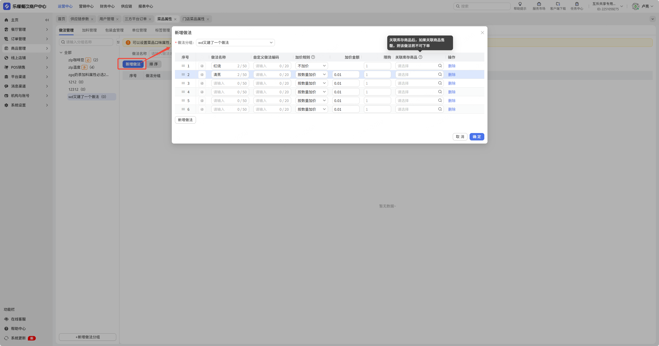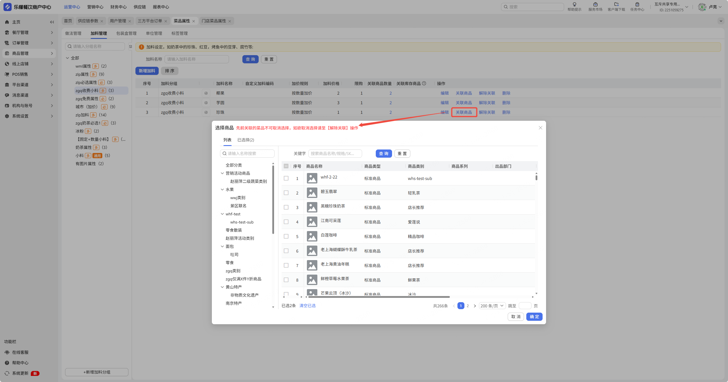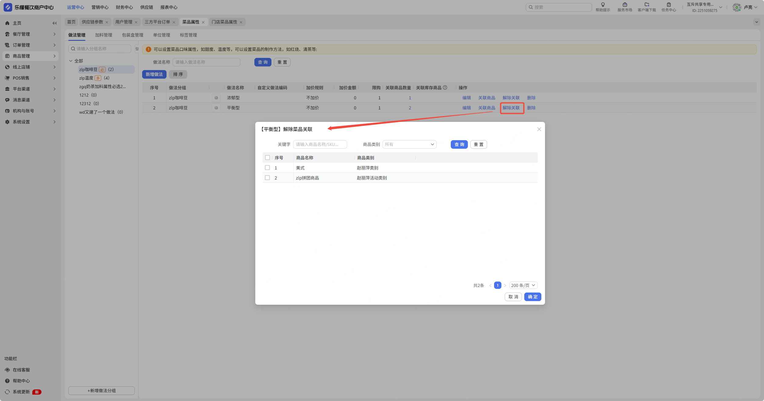 解除关联,选择商品去掉关联后,该商品不应用该加料。