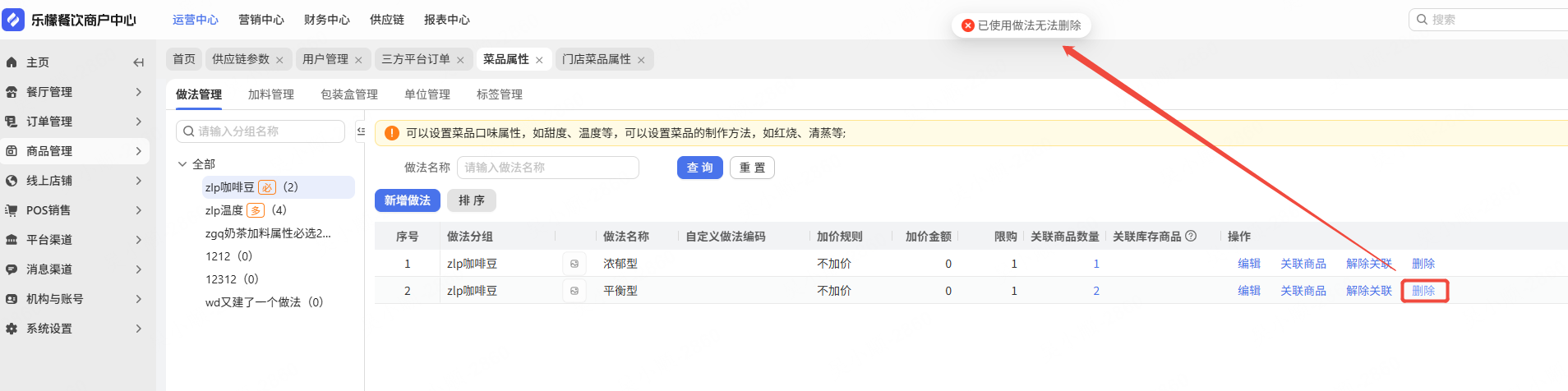 解除关联,选择商品去掉关联后,该商品不应用该做法。