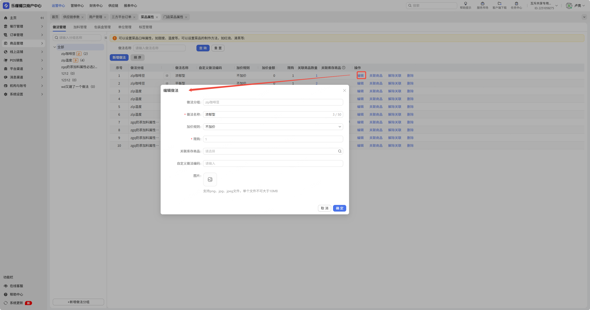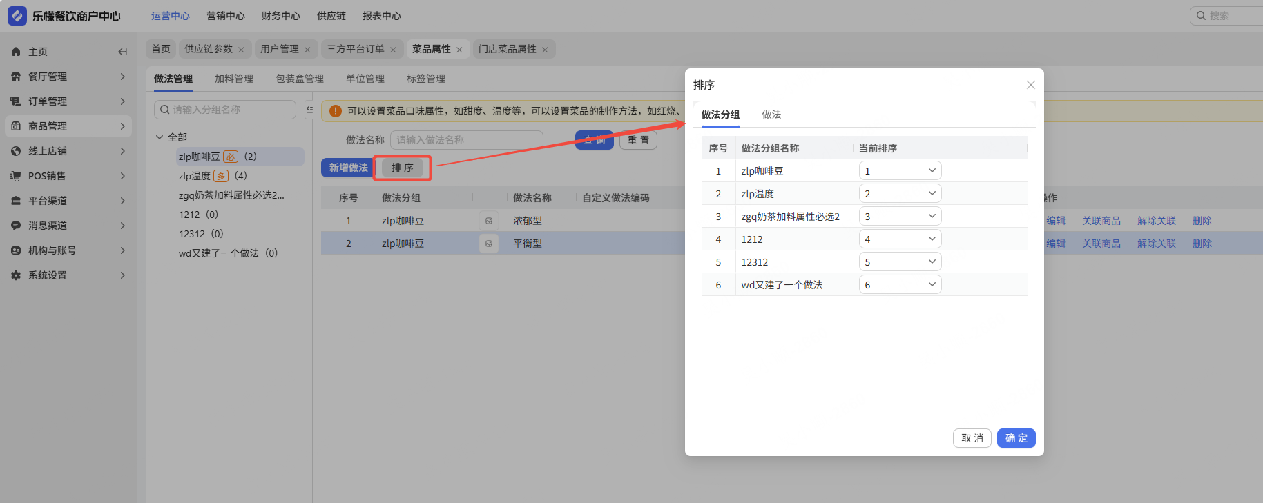支持设置做法分组和做法默认排序,实际以商品中修改后的排序为准