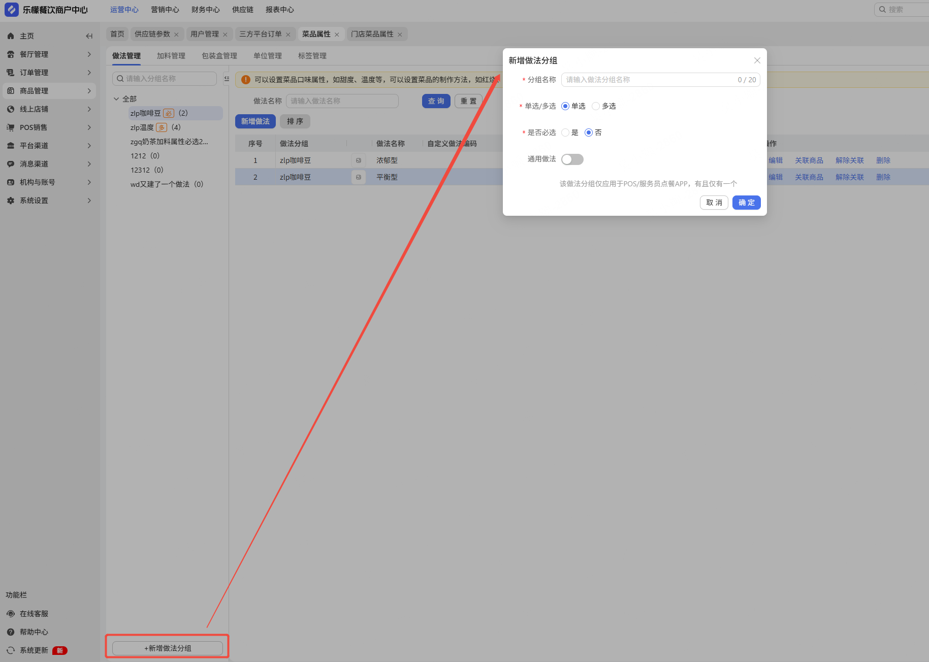 注意:原通用属性有且仅有一个,调整为:通用做法和通用加料,分别有且仅有一个。