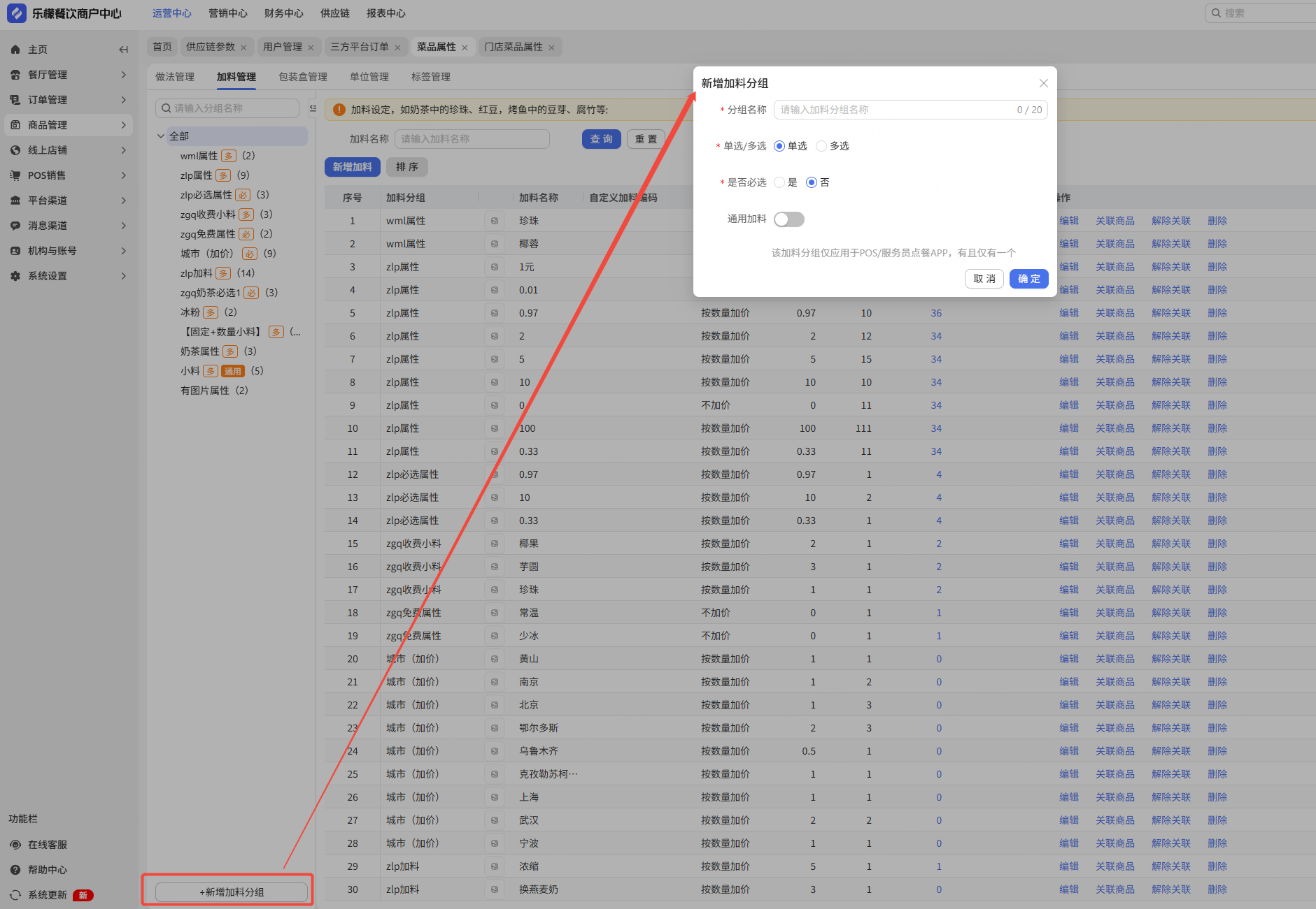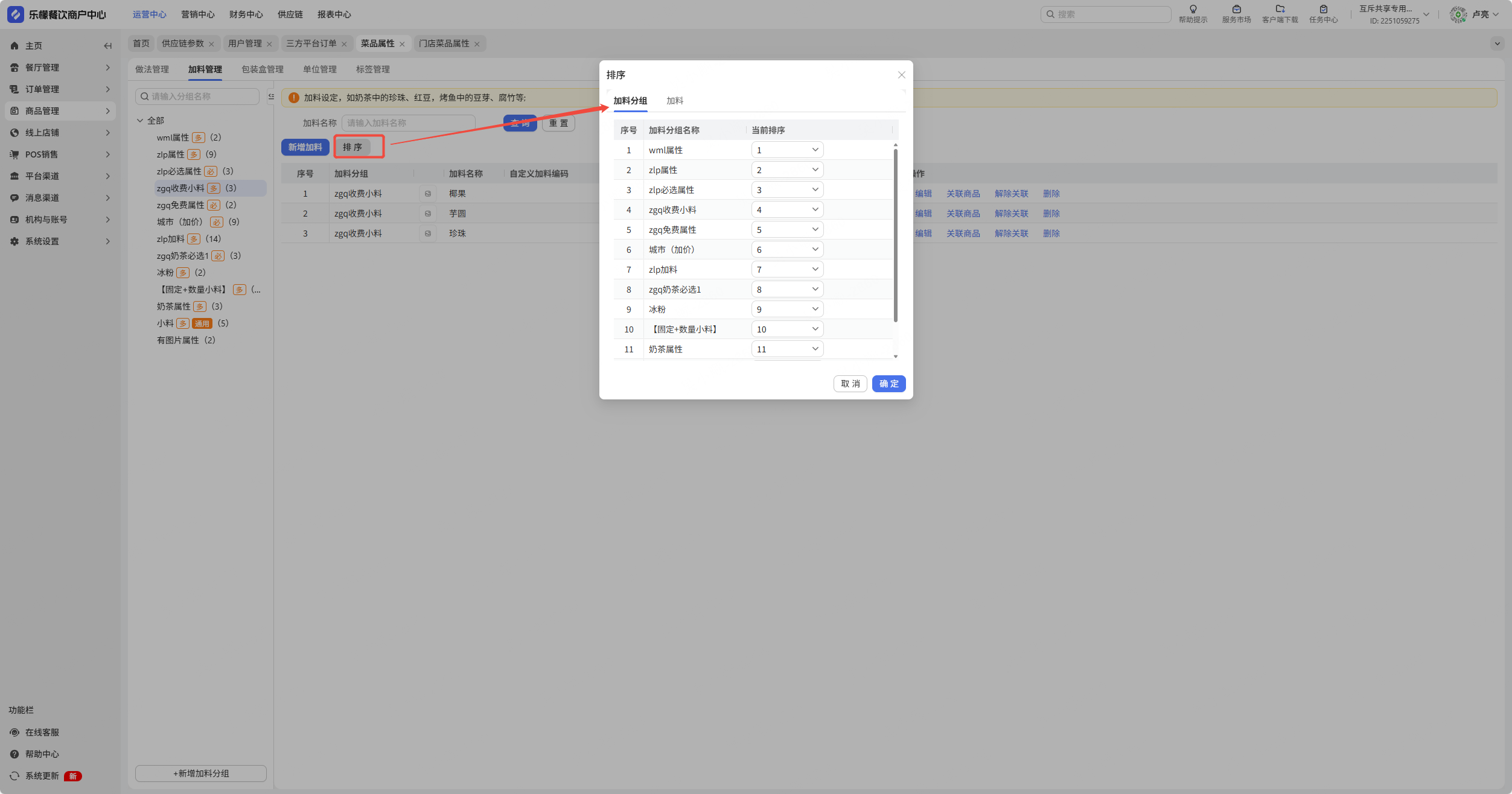 支持设置加料分组和加料默认排序,实际以商品中修改后的排序为准