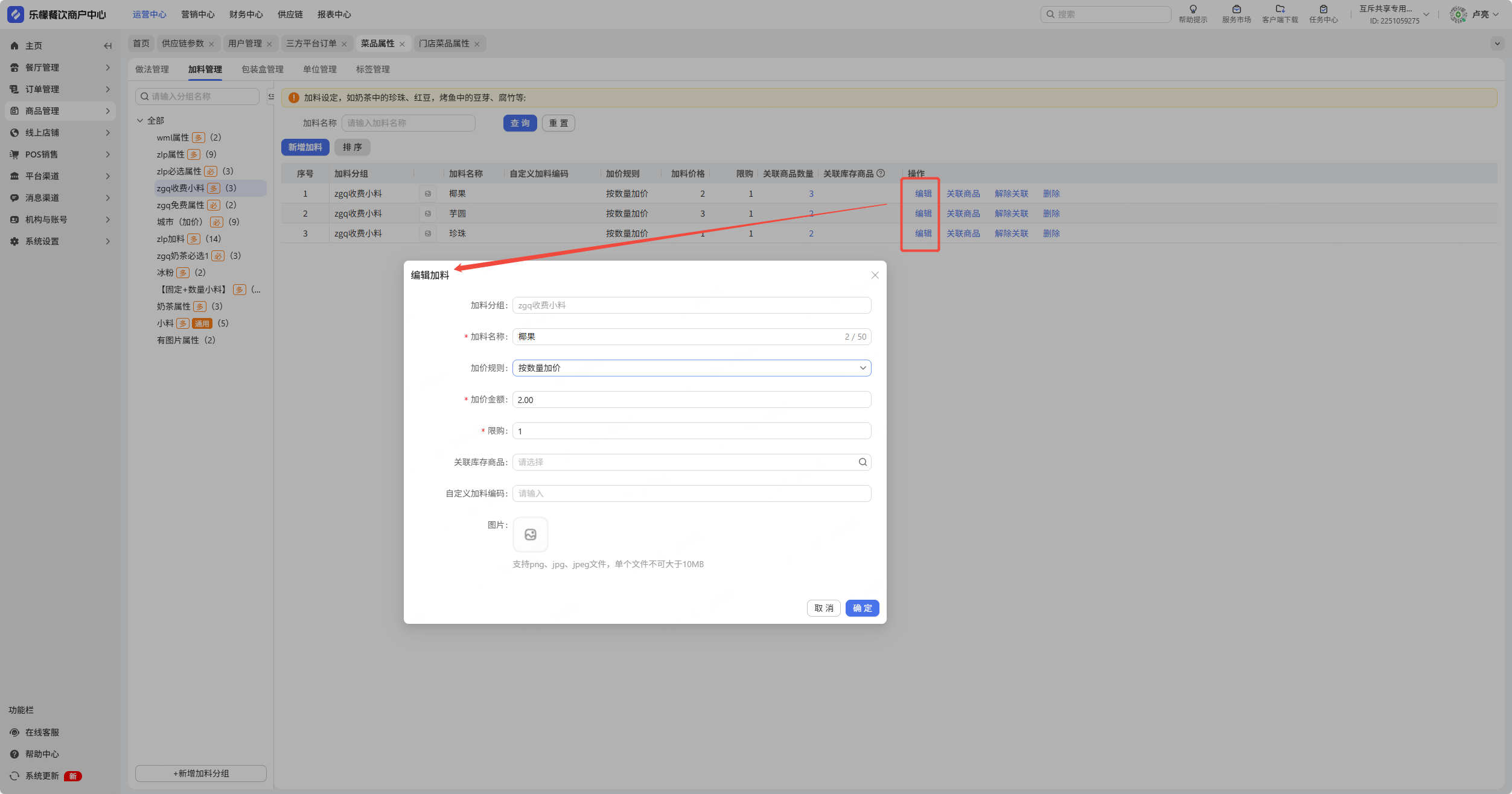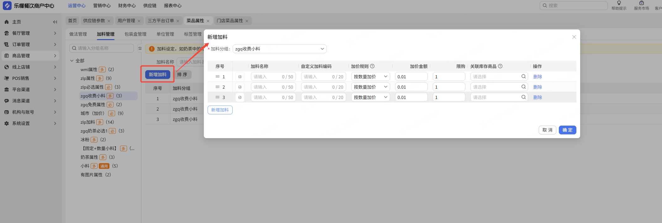支持批量新增某加料分组下多个加料,但仅支持单个加料编辑;