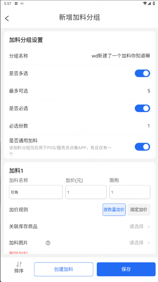 通用加料:该加料分组仅应用于POS/服务员点餐APP,有且仅有一个;