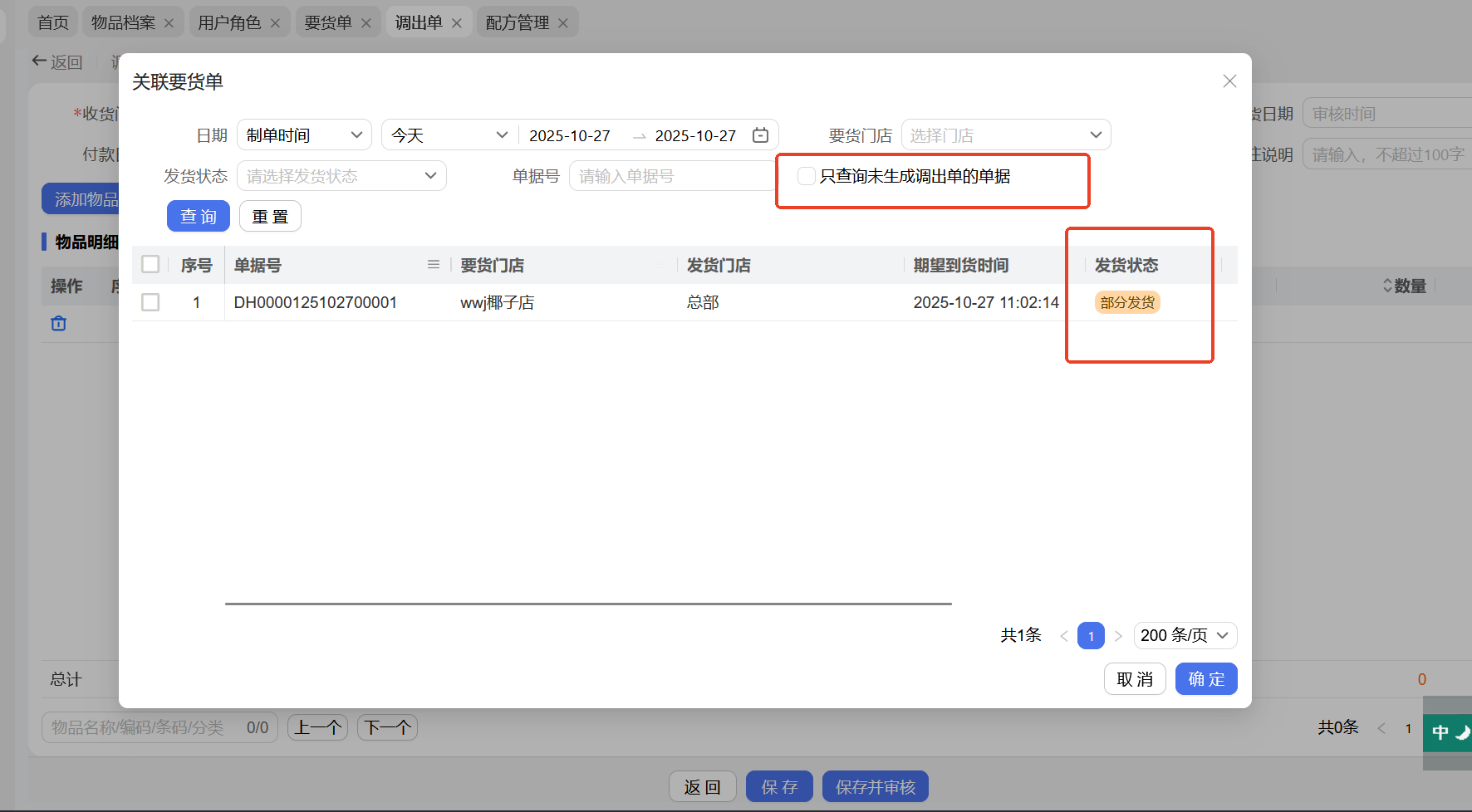 调出单通过要货单新增时,可筛选要货单的发货状态,也可查询未生成调出单的单据