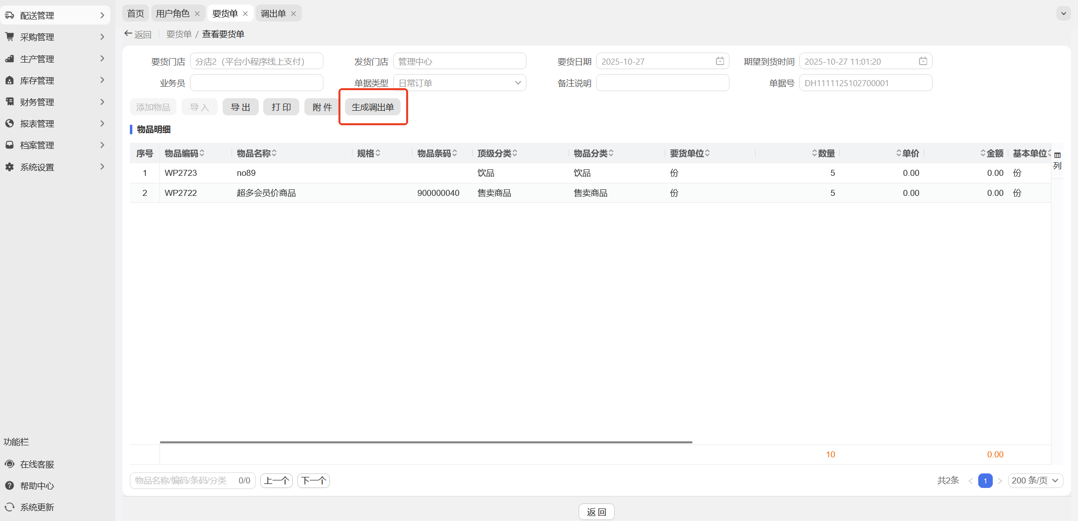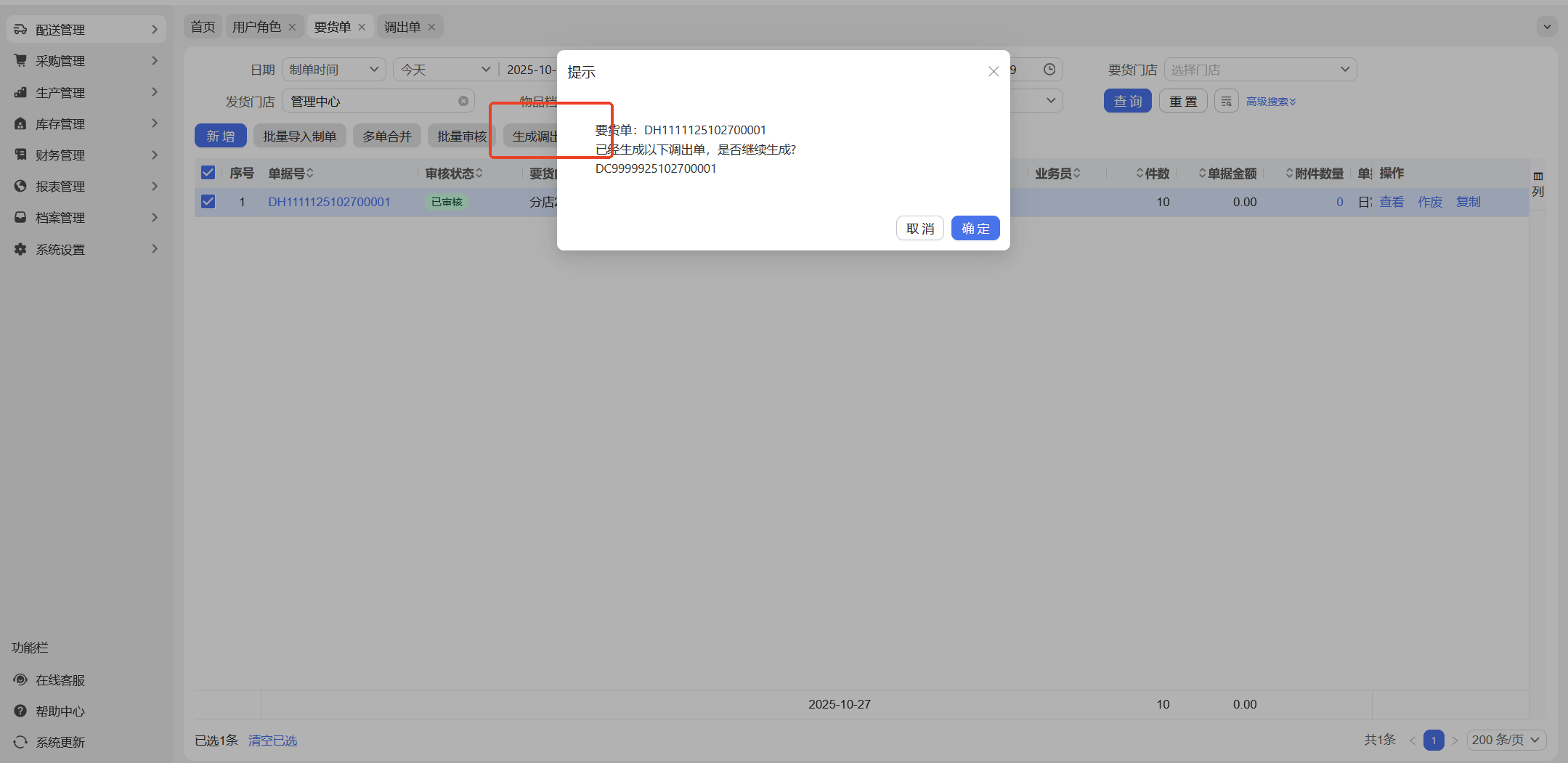 路径:供应链-配送管理-要货单、调出单