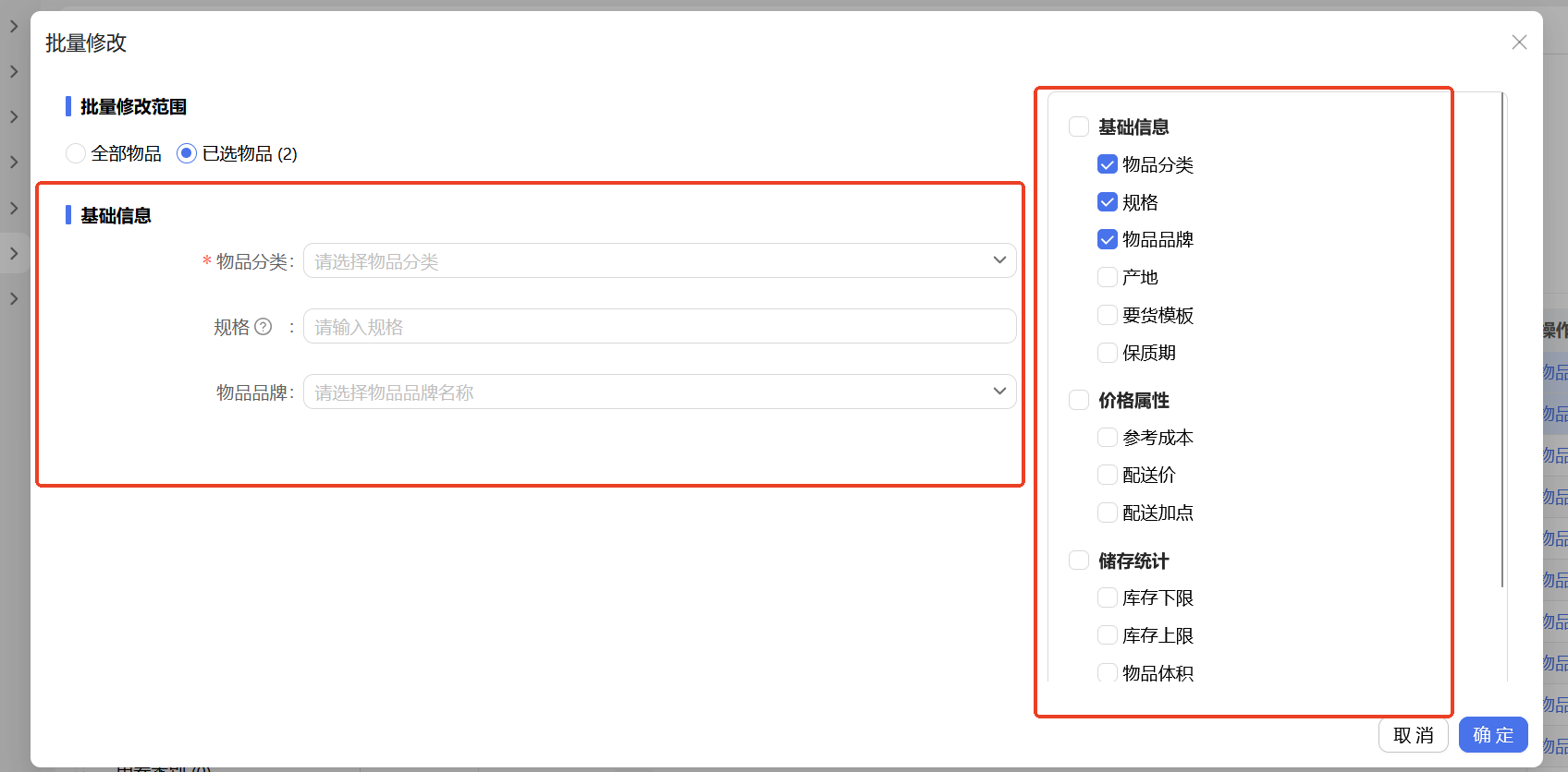 选择物品点击后,可在右侧选择需要修改的字段,勾选后会展示在左边区域进行修改