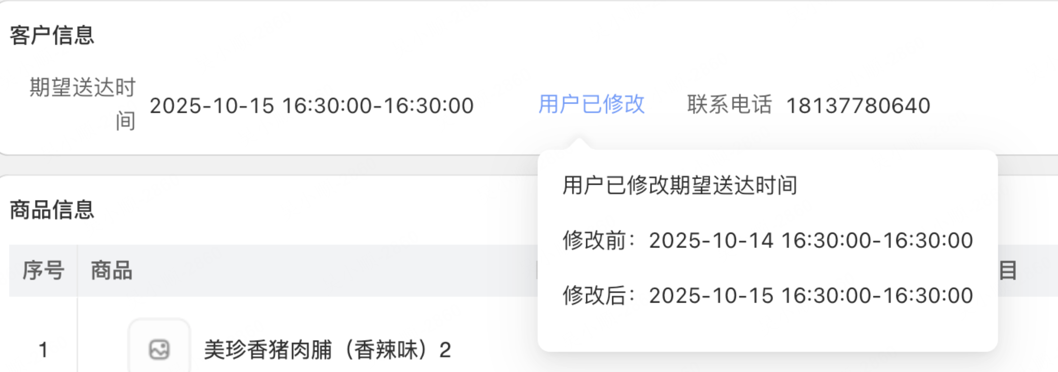 饿了么外卖接口更新,支持用户更改配送时间,监听到修改送达时间消息后,展示“用户已修改”按钮,显示修改前和修改后的时间。