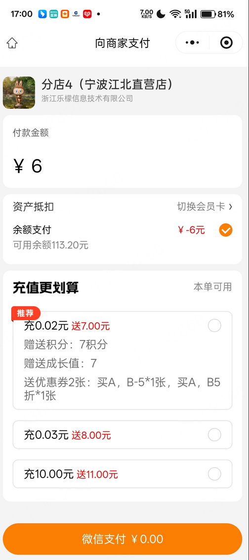如果客户再选择了充值100送10元活动(应付100元),则微信支付为100元。充值成功直接余额抵扣。