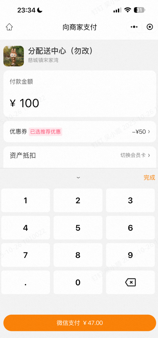 如:客户输入100元,优惠券减10元,积分抵10元,余额20元,则剩余微信支付60元。