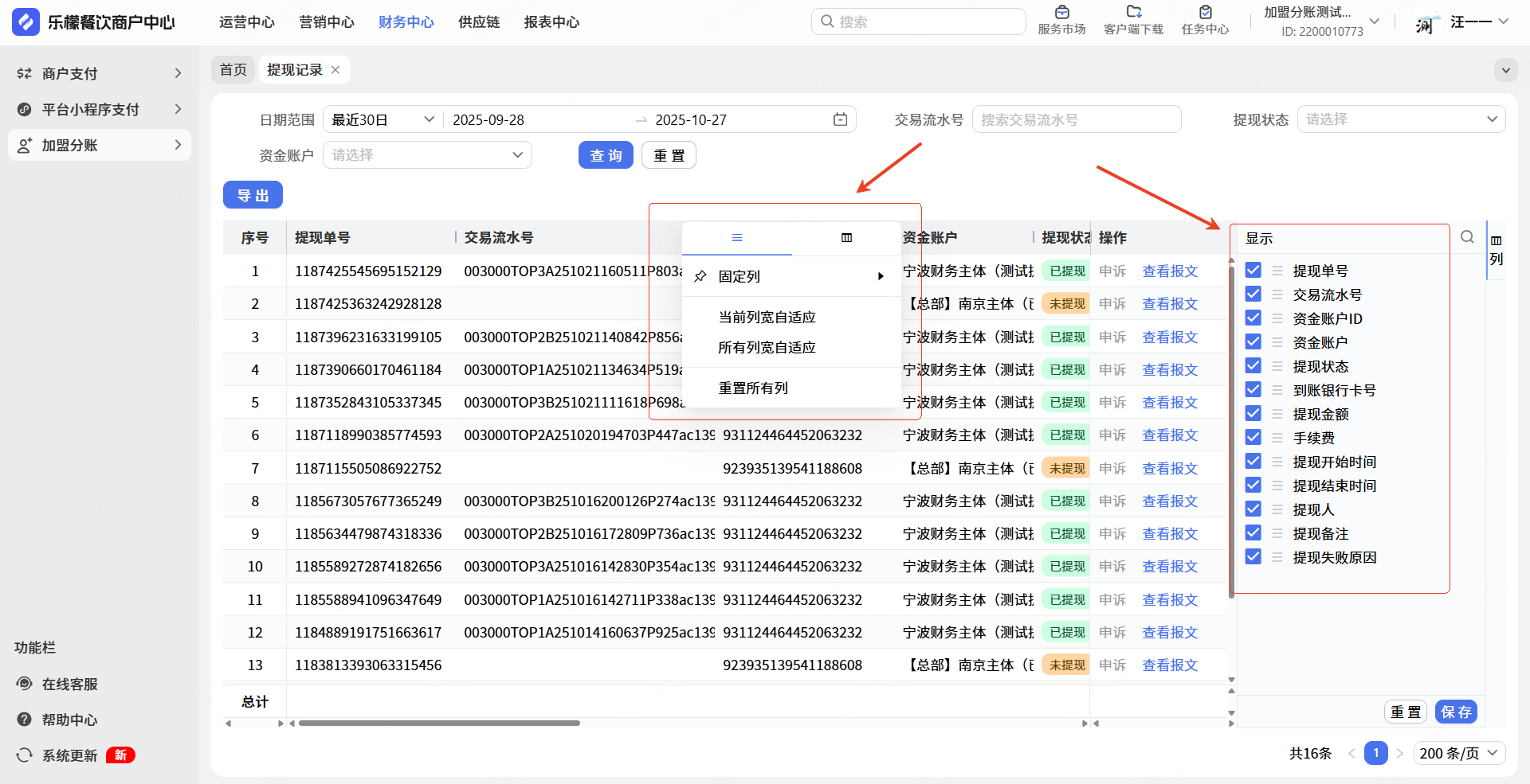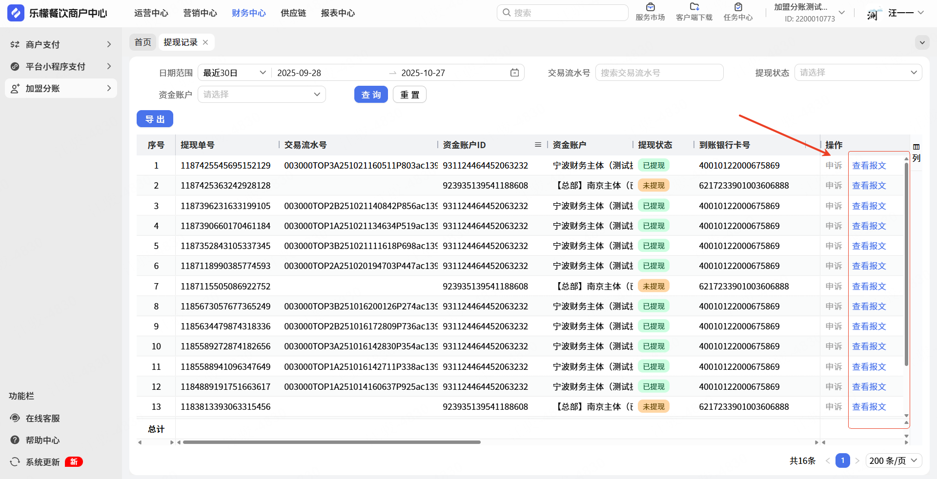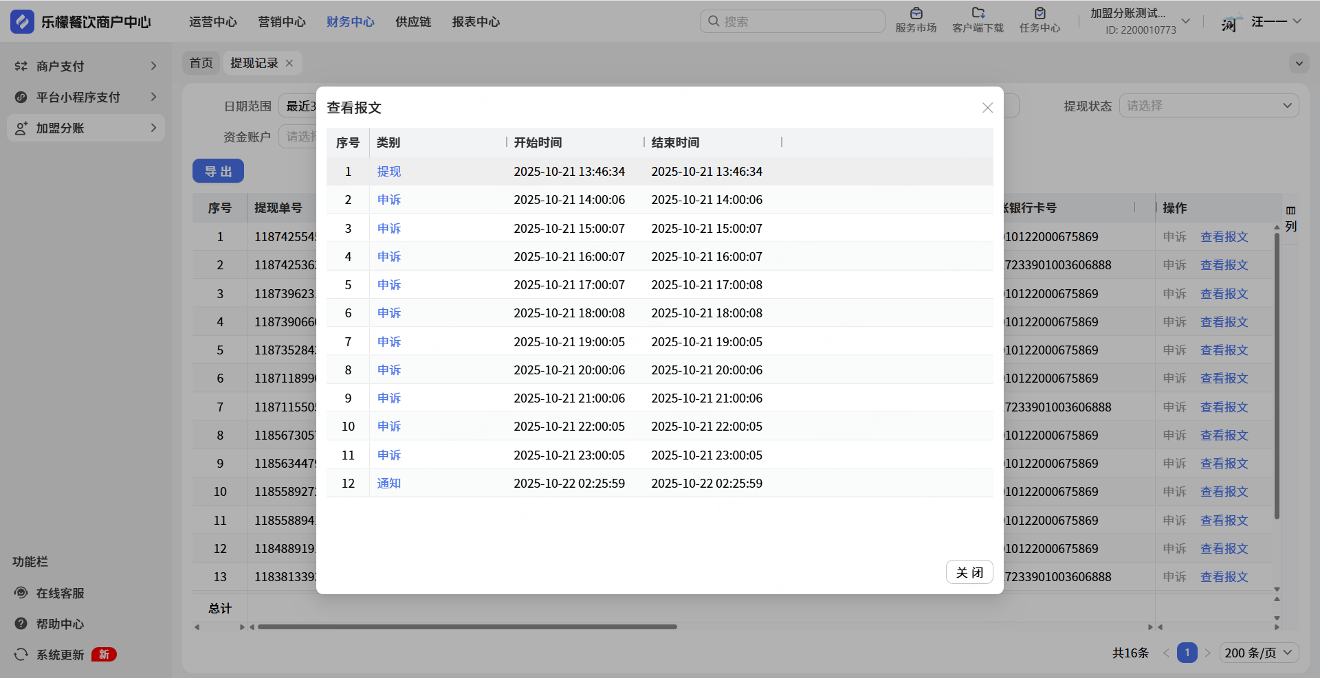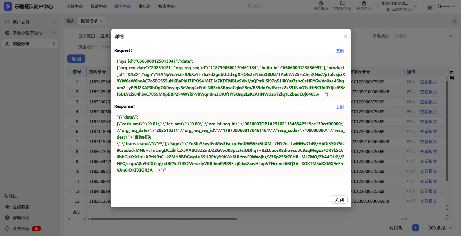 1.提现记录增加报文显示,固定在右侧。点击弹框展示报文,鼠标点击时展示具体报文并支持报文复制。包括汇付和扫呗一账通平安通道。
