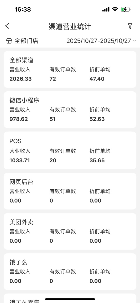APP查看渠道营业统计时,相同数据直接罗列展示,无法横向对比。