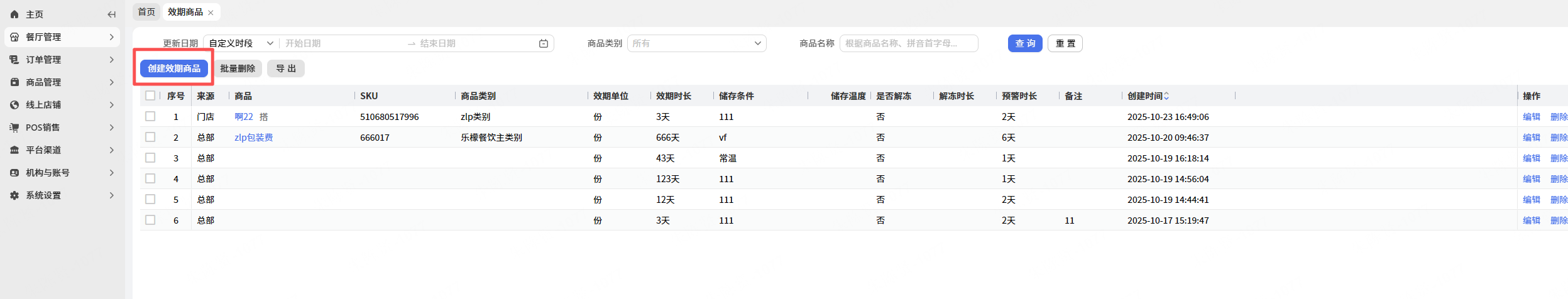 门店效期商品:总部下发的效期商品+门店自主创建的效期商品
