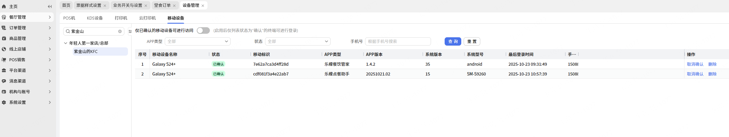 路径:餐厅管理-设备管理-移动设备