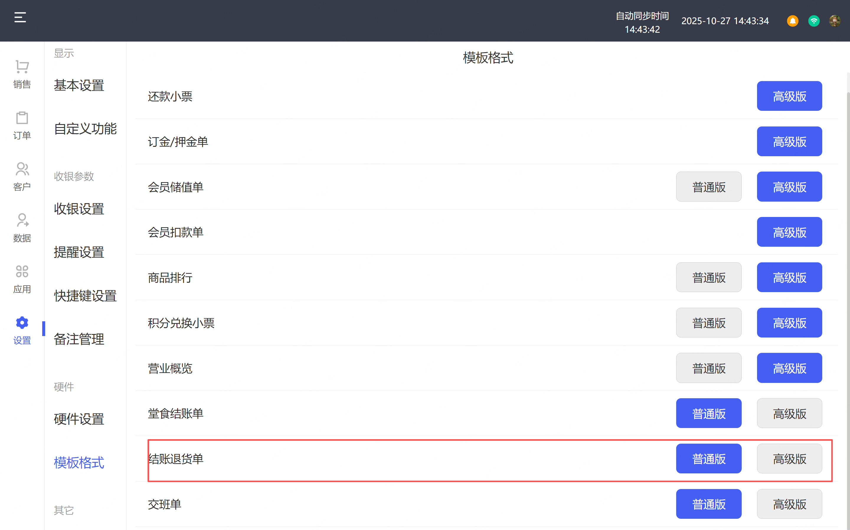 7.【非台位POS】接入高级模板-堂食结账单退货的【结账退货单】打印